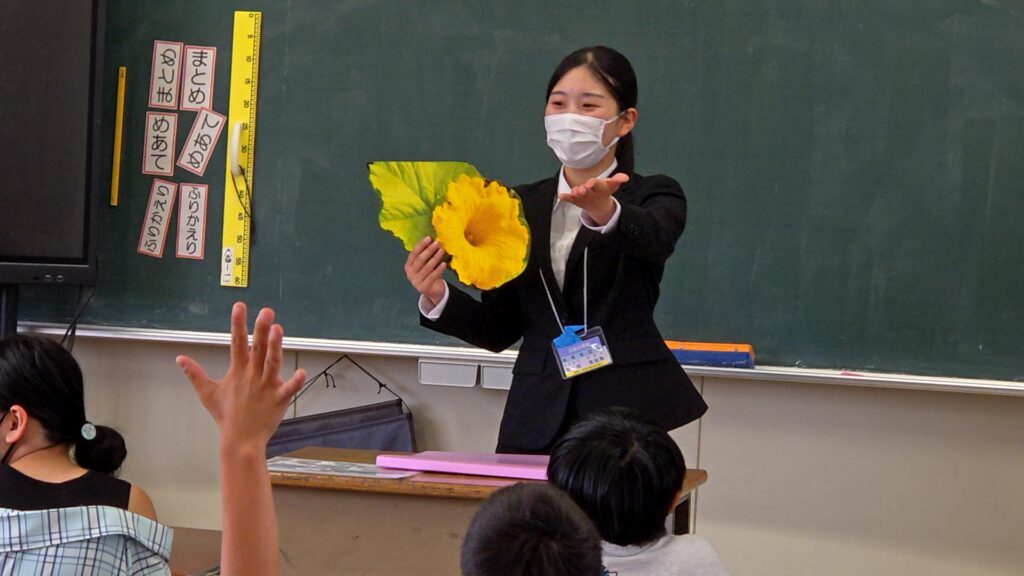 保育所や学校では、栄養士が食育を行うことも多く、実際に現場で子どもたちと触れ合いながら給食に使用されている食材を題材に簡単な食育指導を行います。小学校での実習をしている学生からは、「子ども達から予想外の質問をされて焦ることもありましたが、その日の給食に使用されている『かぼちゃ』を取り上げたので、興味をもって聞いてくれました。学校給食の大切さ、栄養士の果たす役割を改めて理解することができました。」と、実習は大変ですが、その分学びも多く、栄養士としてのスキルを磨く貴重な経験になりました。