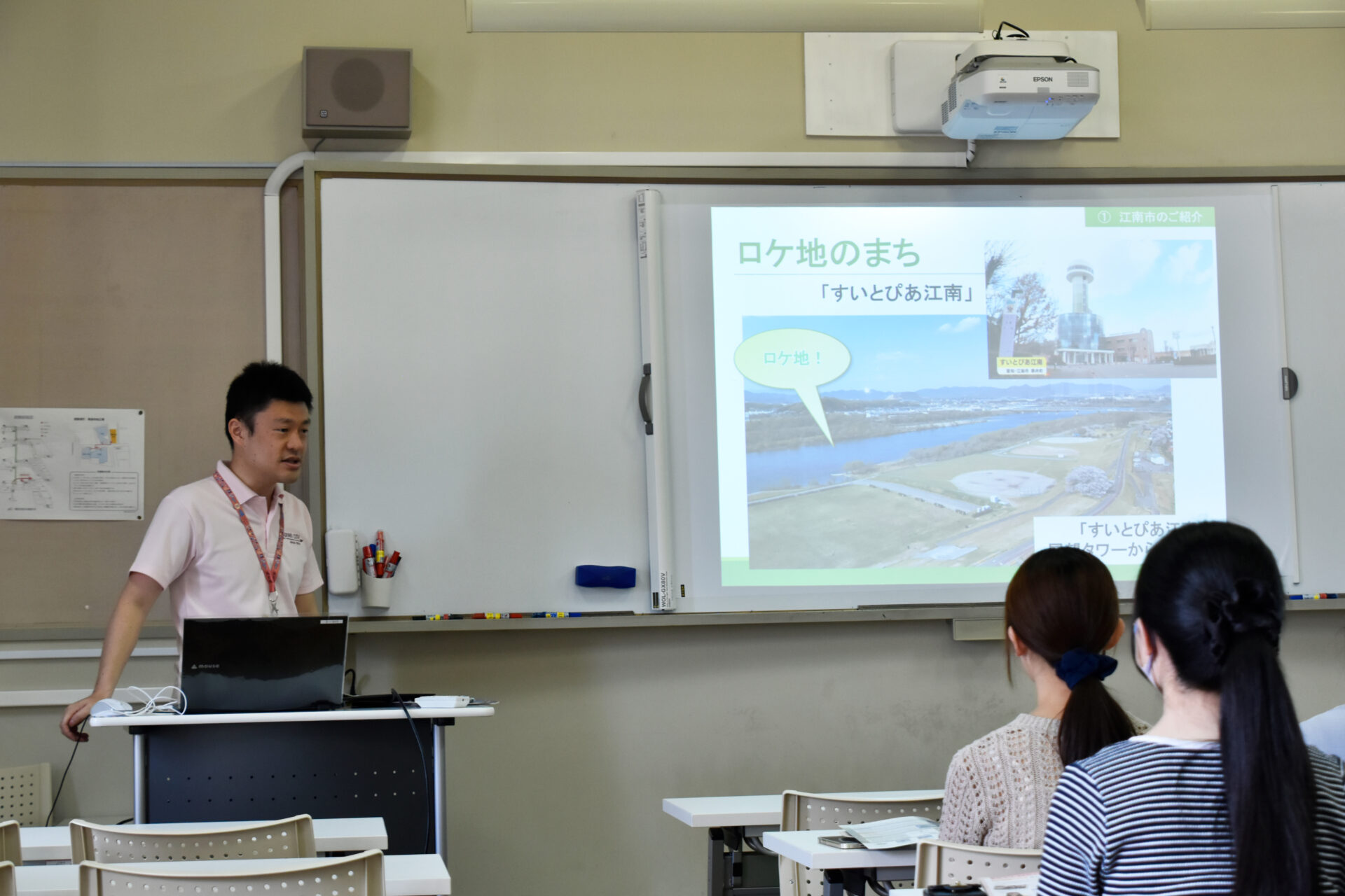 江南市役所の方からは、江南市について、藤の花はもちろん、ドラマや映画のロケ地としても使われている場所があることなど、江南市の魅力について説明をしていただきました。