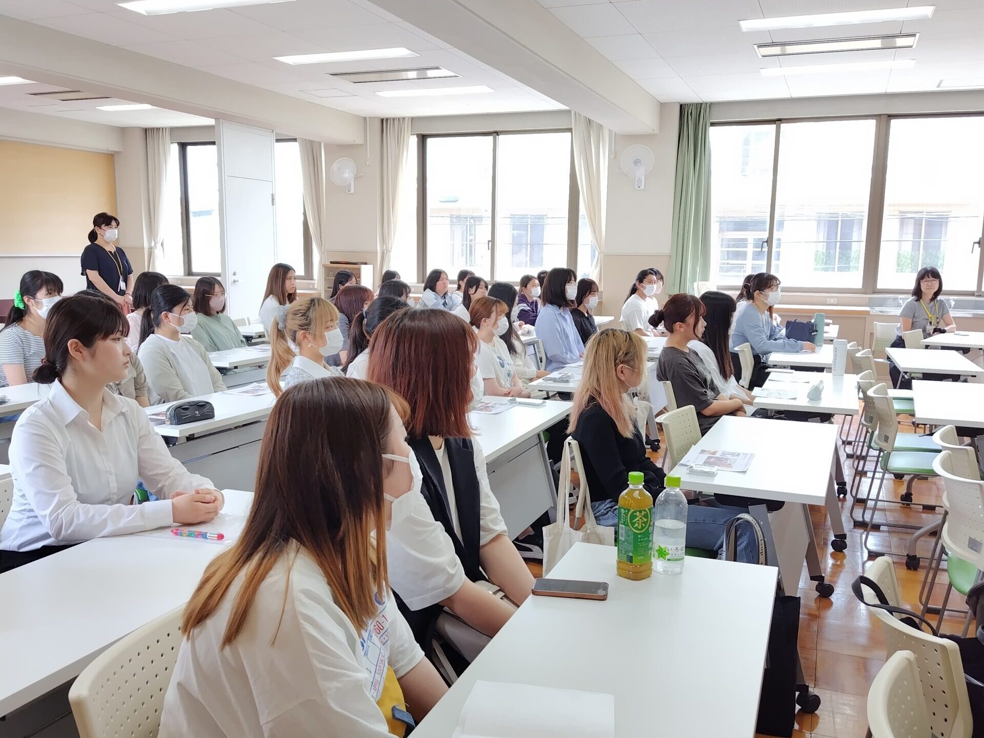 老人保健施設・病院(委託給食会社)保育園とそれぞれ違う職場の栄養士業務について、1日の流れや、やりがいについて知ることが出来ました。校外実習から帰ってきたばかりの2年生は、行くことができなかった事業所の内容を真剣に聞いていました。1年生はまだどこで栄養士として働きたいか等具体的なビジョンがない学生が多かったため、今後の参考になった様子でした。