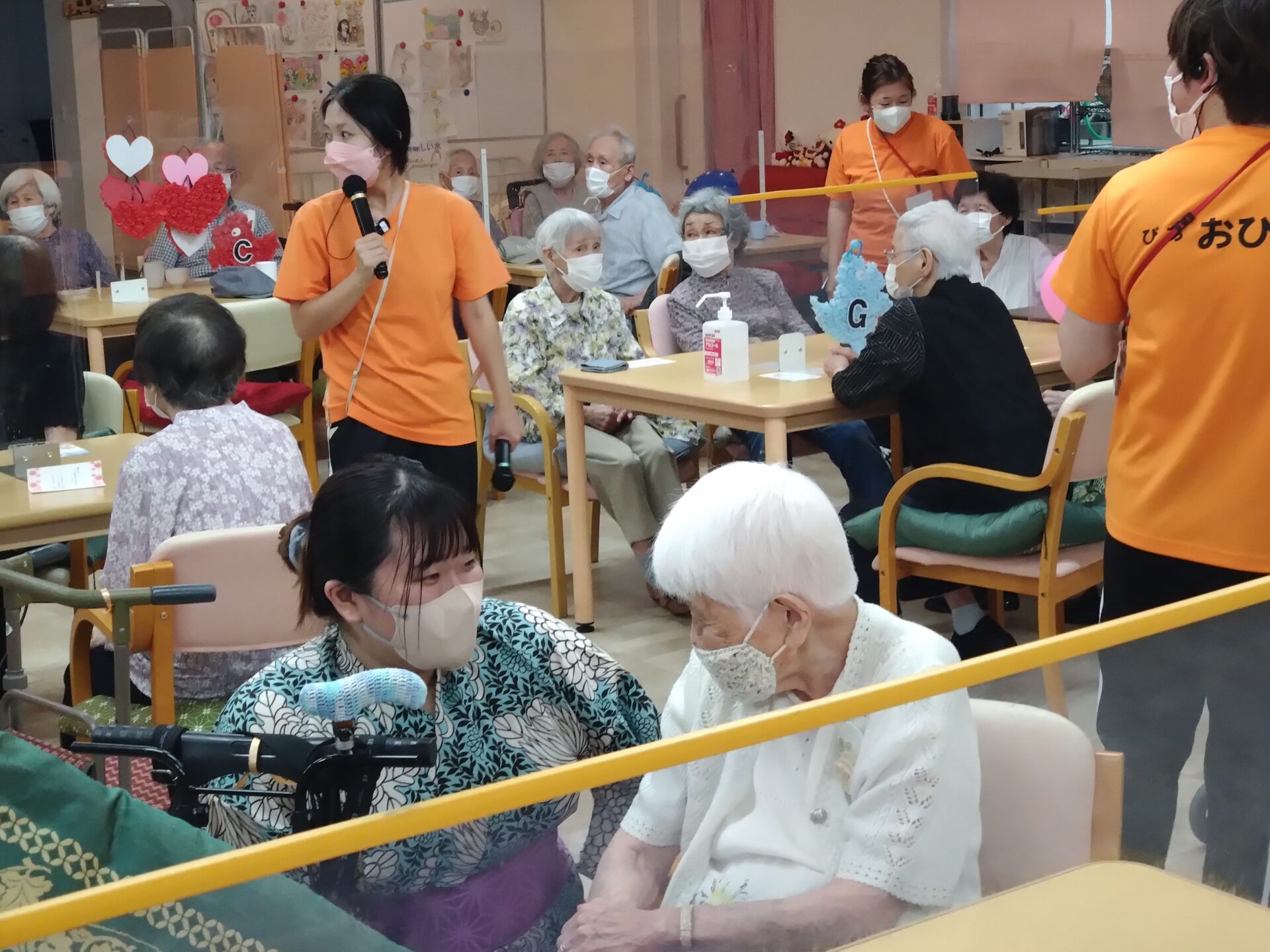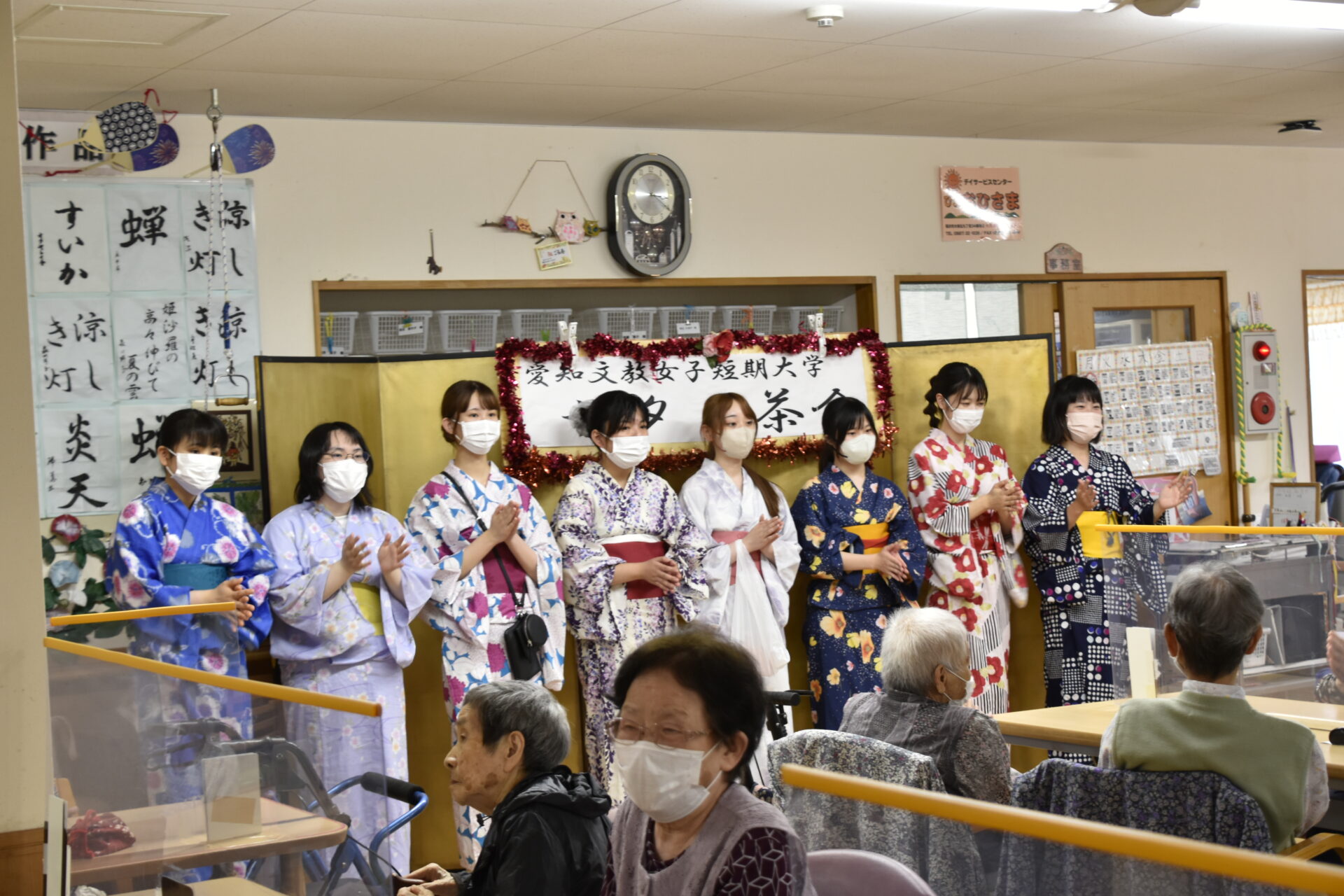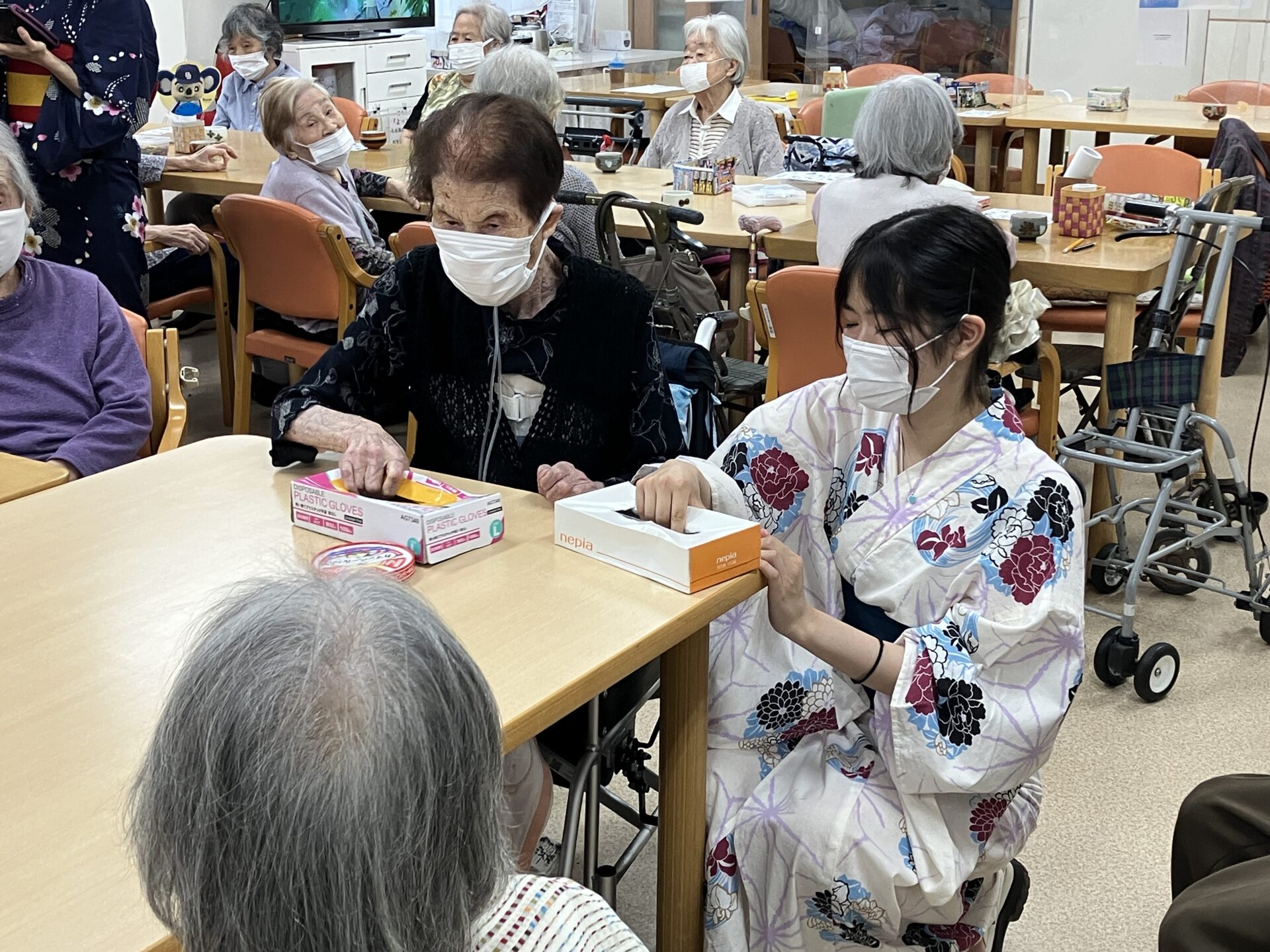 色鮮やかな浴衣姿に着替えて、それぞれの施設に分かれ、はがきをお渡しし、童謡「たなばたさま」を歌い、ゲームや七夕飾りなどで交流を持ちました。昨年お届けしたはがきを持って参加してくださった利用者の方もいて、嬉しくなりました。学生との交流をとても喜んでいただけました。学生も最初は緊張していた様子でしたが、次第に打ち解け、楽しい時間を過ごすことができました。