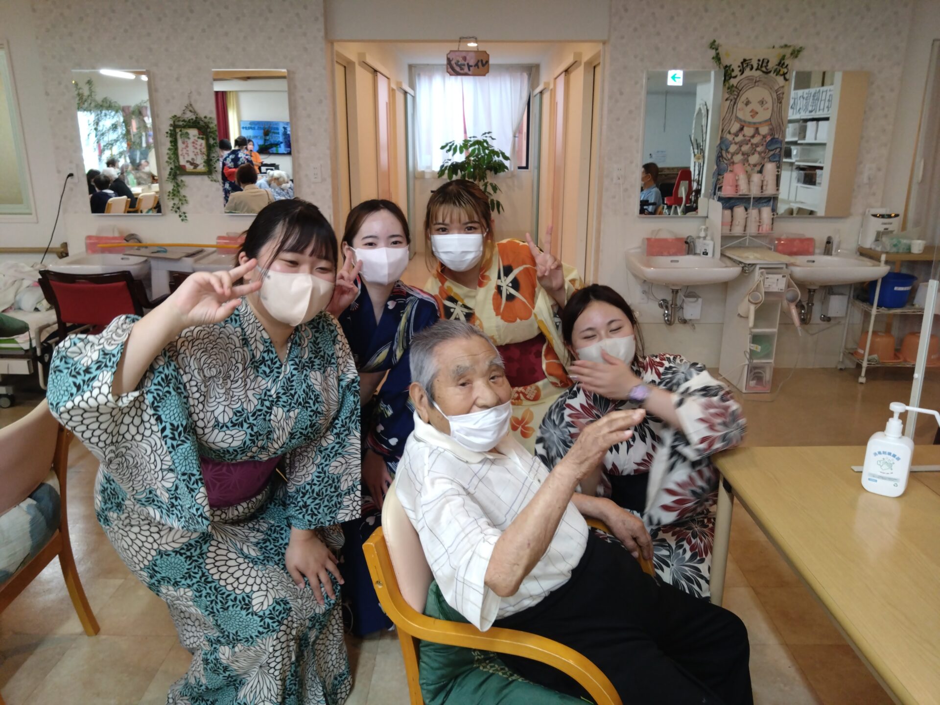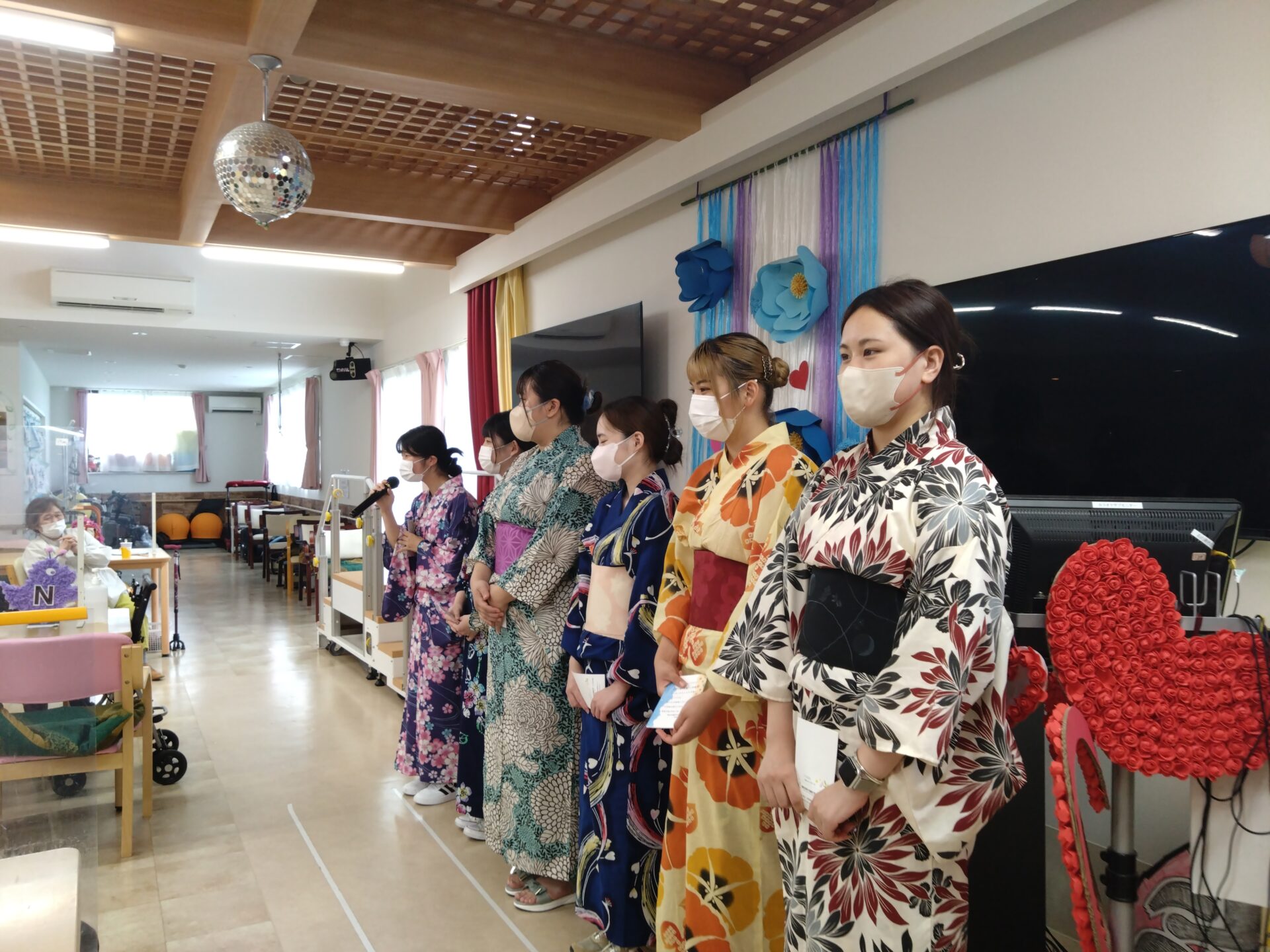 7/1(月)七夕には少し早いですが、特別養護老人ホーム信竜、ケアハウス、デイサービスおひさまに浴衣を着て、七夕交流会に出かけました。
