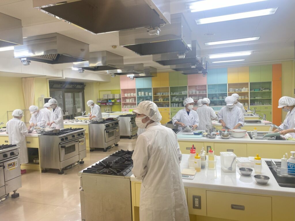 調理学実習Ⅰでは日本食を調理します。調理経験の少ない学生も、調理経験が十分な学生も入り混じったグループで調理を行います。初めの頃は声掛けのコミニュケーションがぎこちない実習ですが、だんだんと声を掛け合うことができるようになってきました。調理学(座学)で学んだ理論を確かめながら実習を進めていきます。