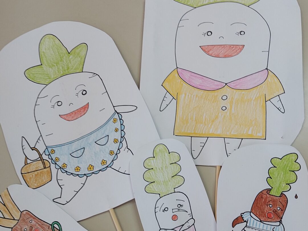 1年次に基礎的なペープサート制作を学び、今回はオリジナリティあふれるちょっと高レベルな作品に挑戦です。自宅で一人で練習しているときにはすらすらできていても、人を目の前にするとセリフが出てこなかったり、ペープサートの動きがぎこちなかったりと、課題がたくさん見えてきました。