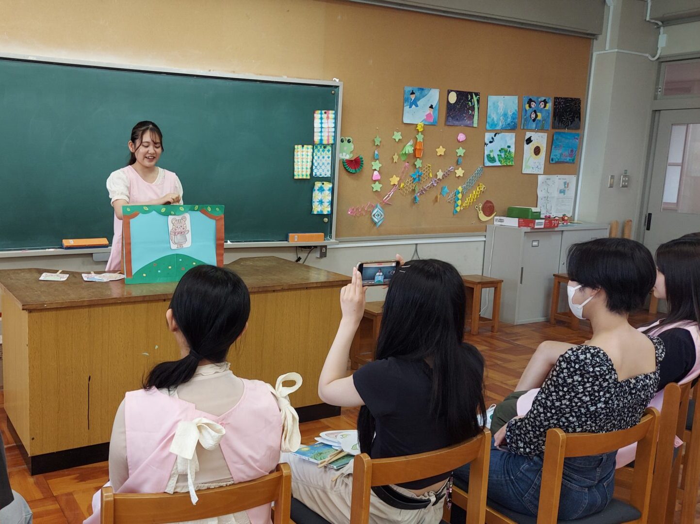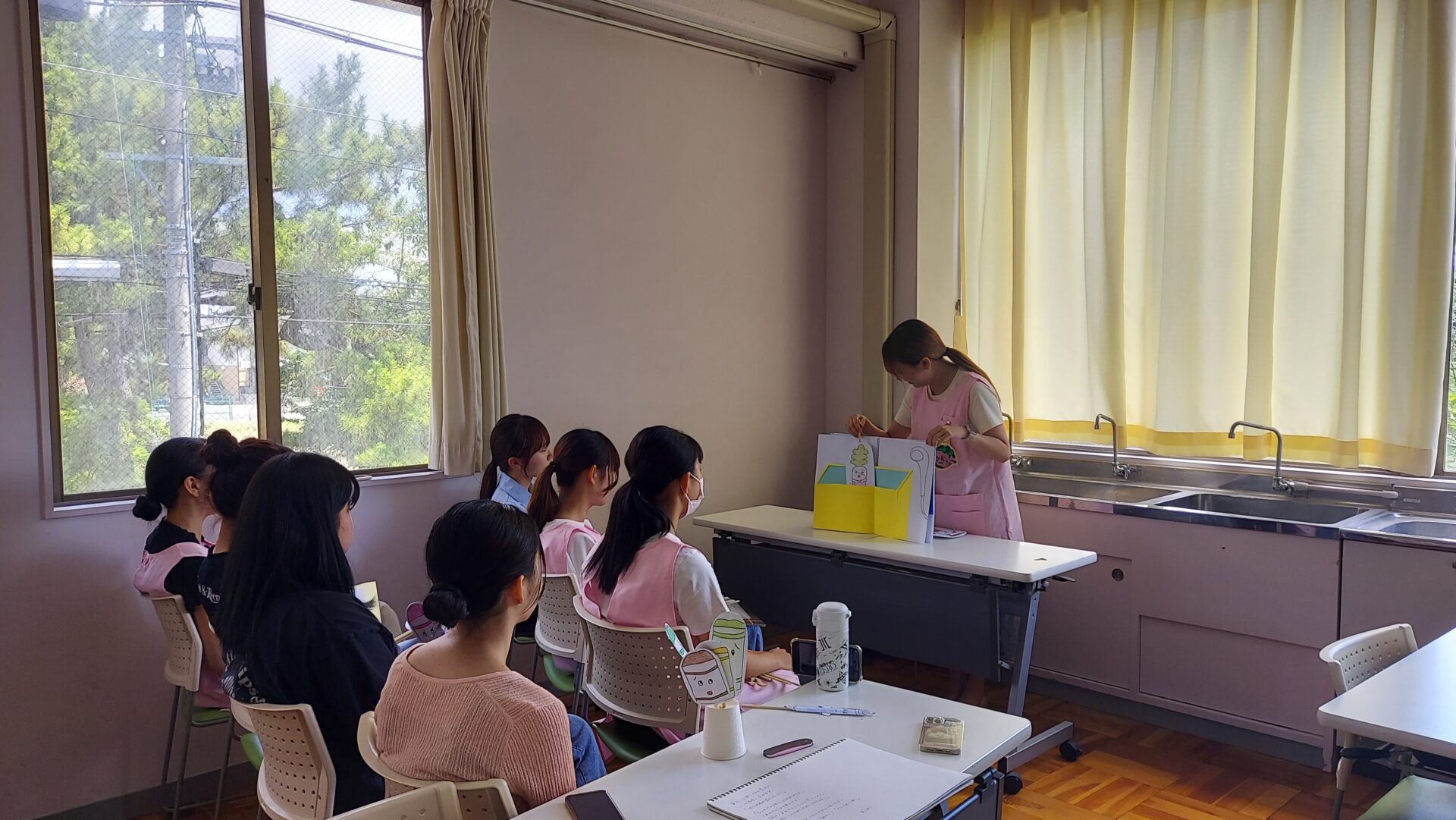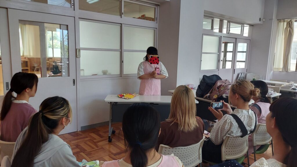 幼児教育学科3部2年生の学生は、8月後半から初めての保育所実習に臨みます。保育実習指導ⅠAの授業では、自作のペープサートの発表会を行いました。