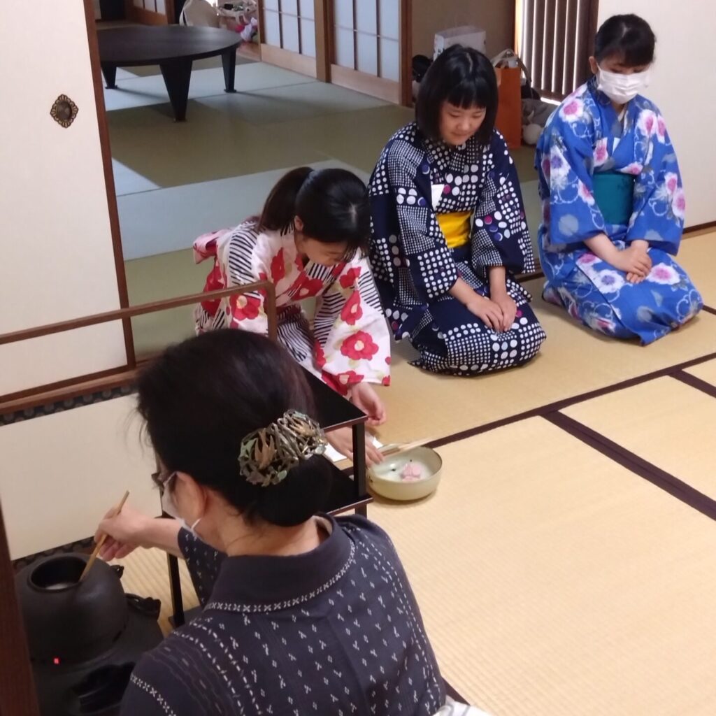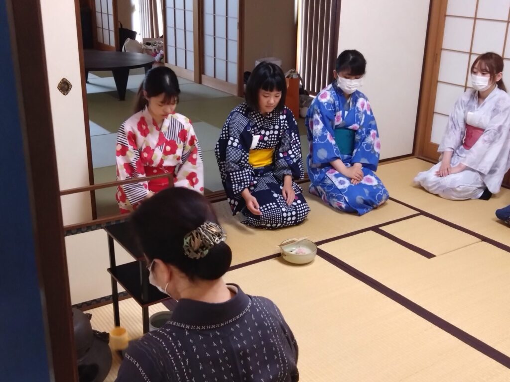 生活文化専攻「日本文化」の授業では、茶道と着付けを学びました。その成果を発表する場として、茶道の授業の最後にお茶会が開かれました。ふすまの開け方や席入り、お辞儀の仕方、お菓子の食べ方、お茶のいただき方など、今まで習ったことを実践しました。また、床の間のお花やお菓子の名前から季節を感じることも学びました。