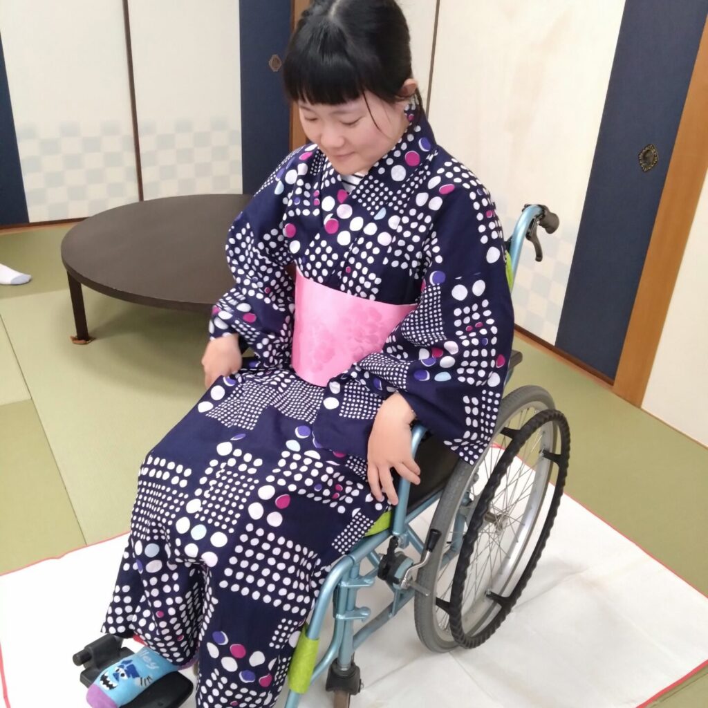 着付けの授業の最後では、浴衣をきれいに着るコツをおさらいしました。袴の着方や男物、子どもの浴衣の着付けも練習しました。着物は年齢や性別を問わず、誰でも楽しめるユニバーサルファッションです。体型を選ばないのも大きな魅力。ゆったりとしたデザインのため、どんな体型の方でも、肩や腕の可動域が狭い方でも簡単に着ることができ、車いすユーザーの着付けも学びました。