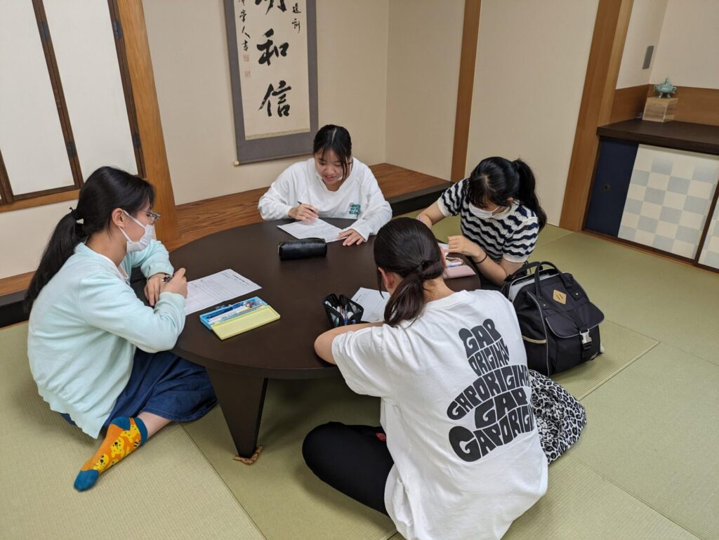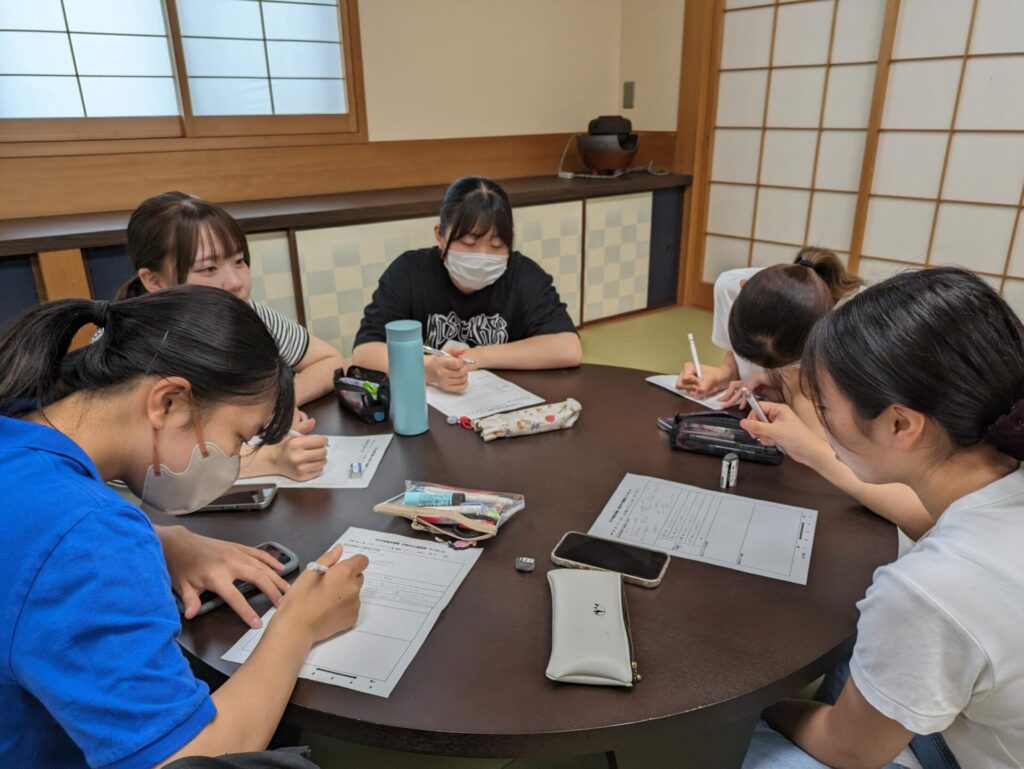 おやこ園を退室した後は、和室でグループワーク。インタビューの様子をお互いに振り返り、相談援助のワークシートを仕上げました。