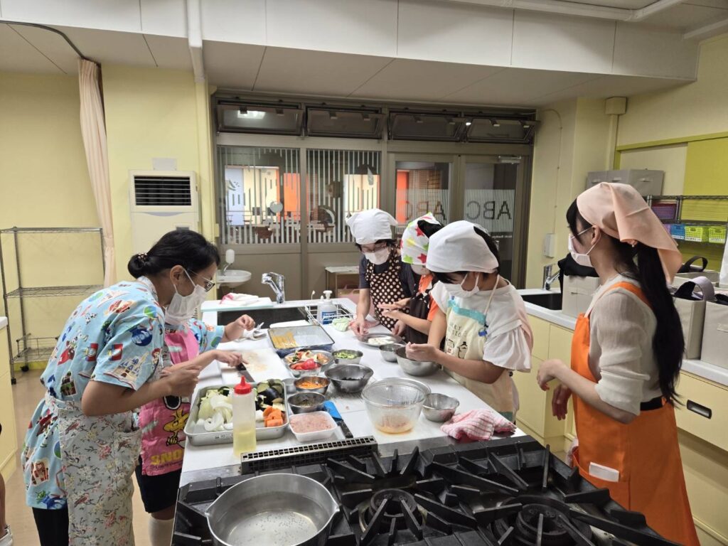 その後、参加者は班に分かれて調理を開始。楽しく料理と生ごみの減量にチャレンジですごみをできる限り少なくすることを心掛けながらの調理実習です。学生スタッフが、細かなところまで気を配り、楽しく調理ができるように声掛けをしてくれたおかげで、スムーズに調理を進めることができました。