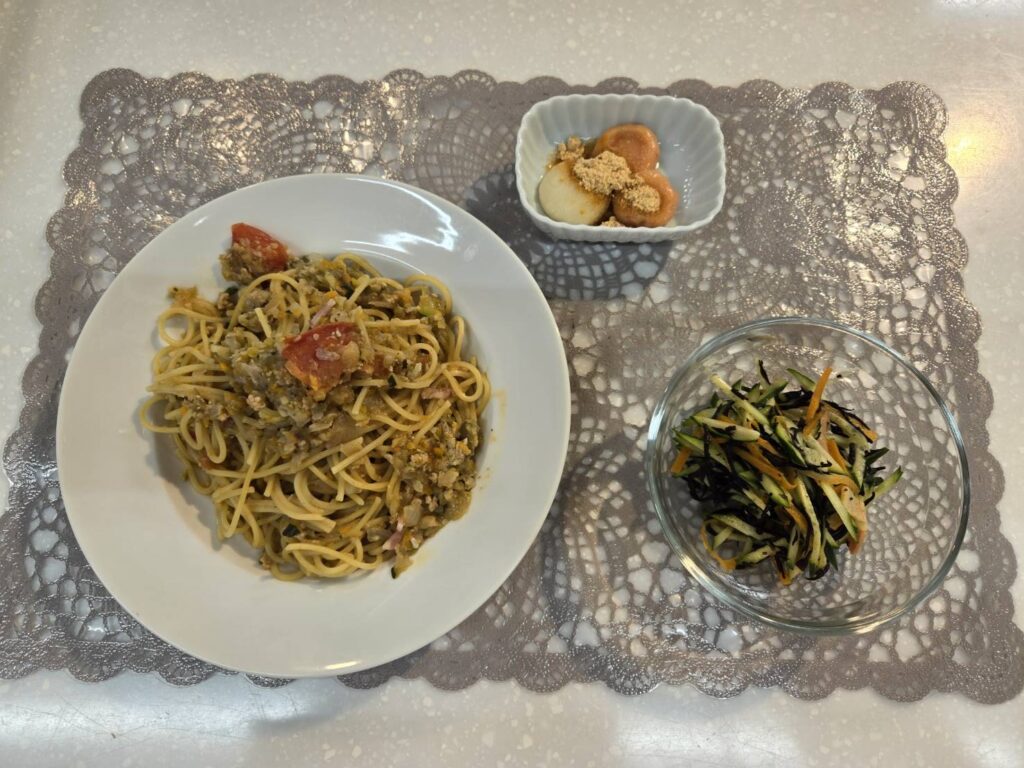 本日のメニューは 夏野菜のたくさんパスタ・スパイスサラダ・とうふトマト白玉の3品。食物栄養専攻の山口先生の生ごみをなるべくださない調理法を使った栄養満点のオリジナルレシピです。おいしく出来上がった料理にみんな大満足でした。