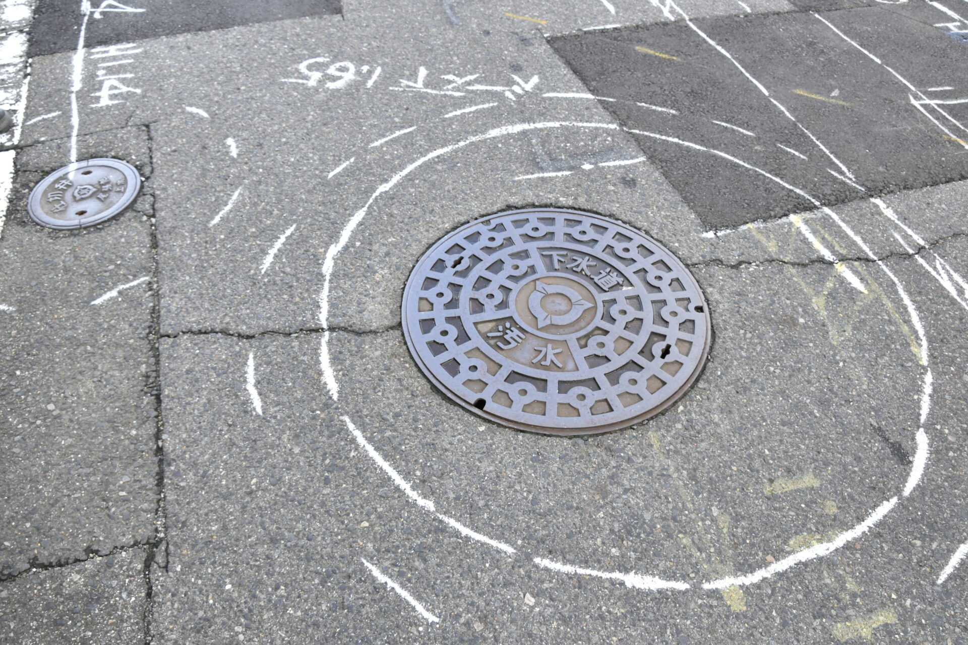 社長の正田様より簡単な説明があり、現場の撮影における注意点などを教えてもらってからヘルメットをつけて撮影に臨みました。例えばマンホールの写真の道路に描かれている白い文字は、地下にどんなものがどれくらいの長さ、深さで埋まっているのか示していたりします。