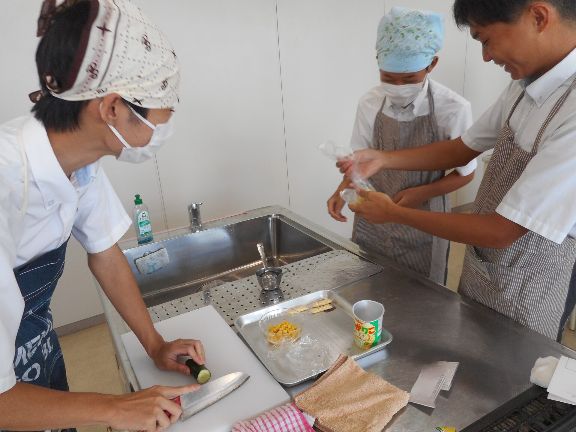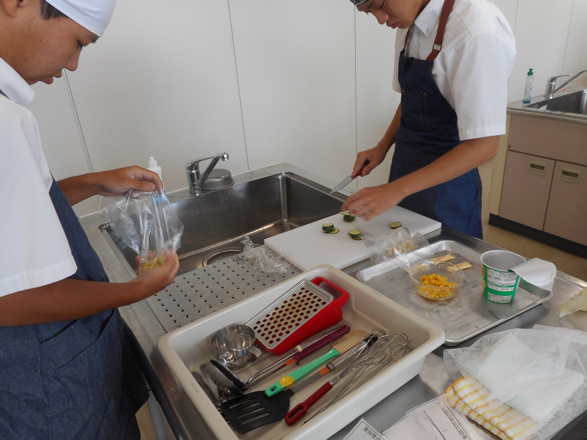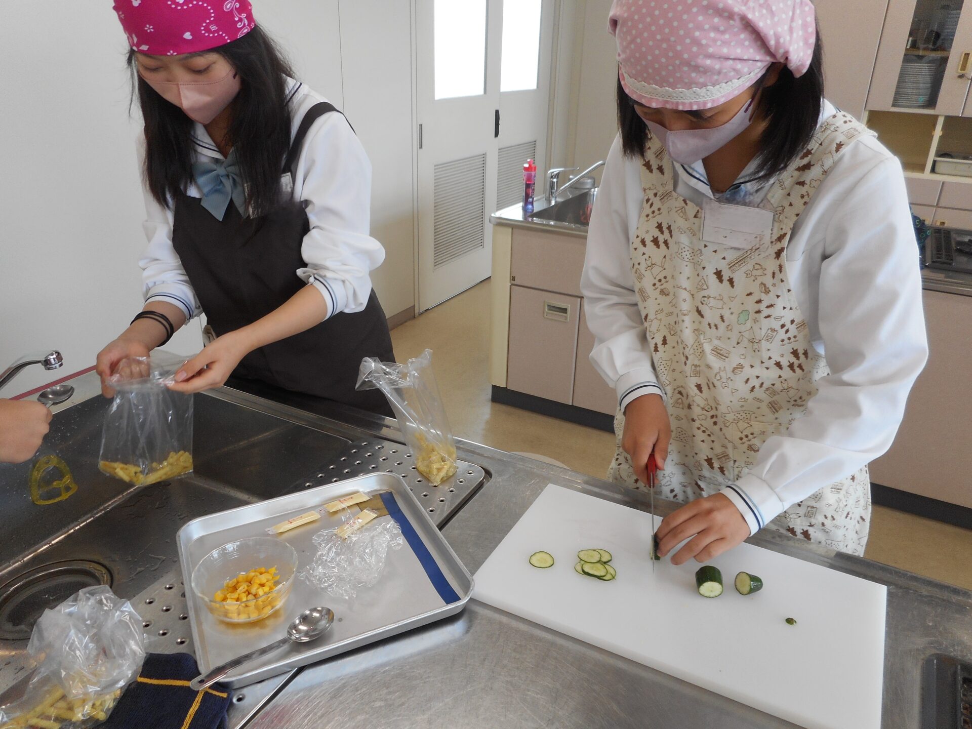 授業中には、少し混ぜすぎてビニール袋に穴が開いてハプニングもありましたが、それも生徒たちにとっては良い学びになり、出来栄えは上々。災害時の食材の調達が困難になるため、普段から家庭での食品備蓄を心がけることを学ぶ機会となりました。