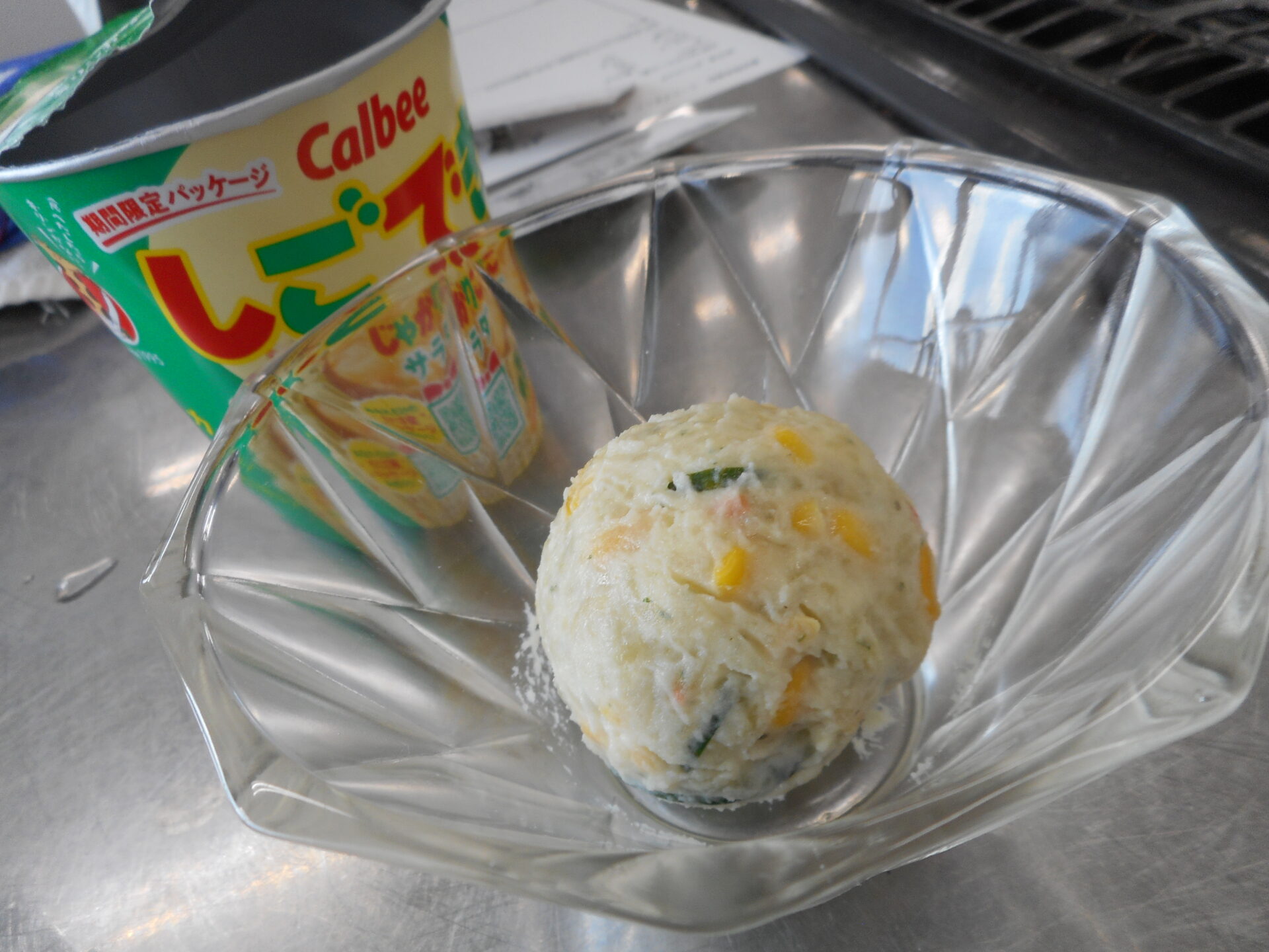 今回のメニューは、ポテトサラダ!驚くほど簡単に作ることができました。 スナック菓子と水、マヨネーズをポリ袋に入れてよく混ぜるだけで、あっという間にポテトサラダが完成することができます。さらに、きゅうりの輪切りや備蓄しているコーン缶を続けることで、栄養バランスも取れた一品になります。