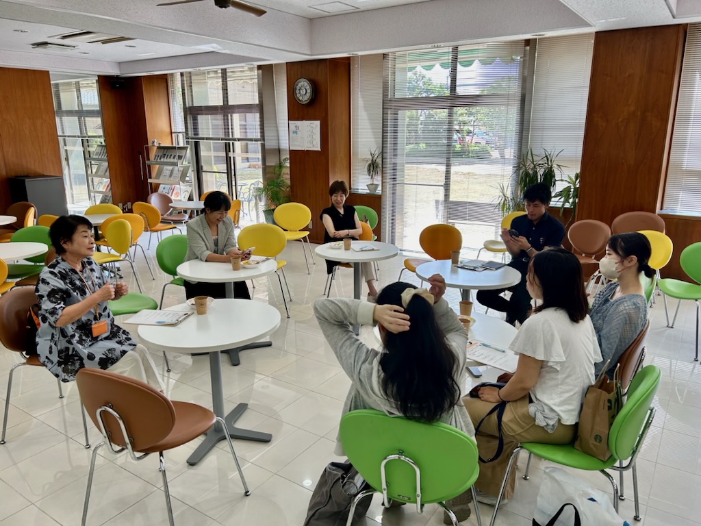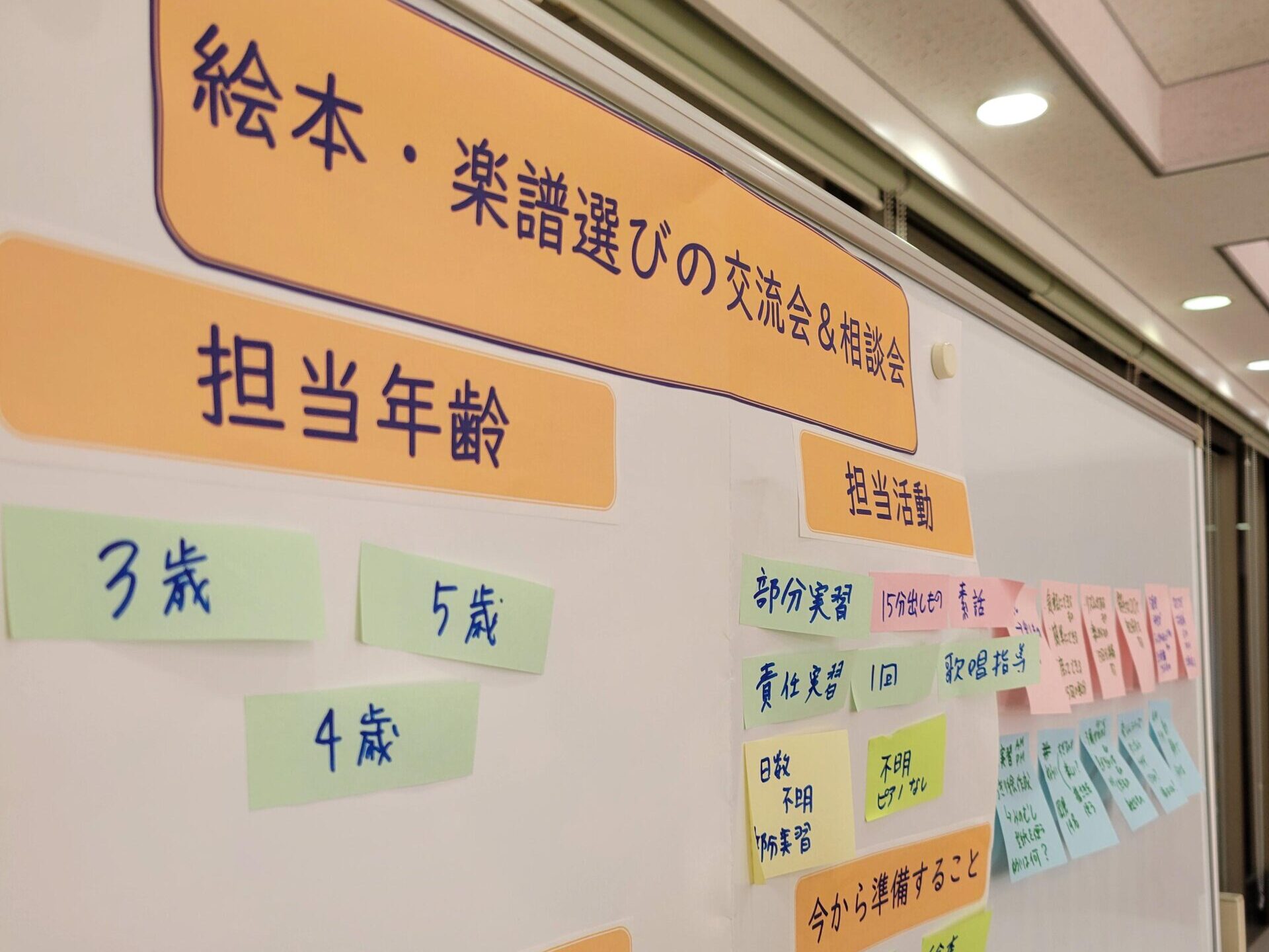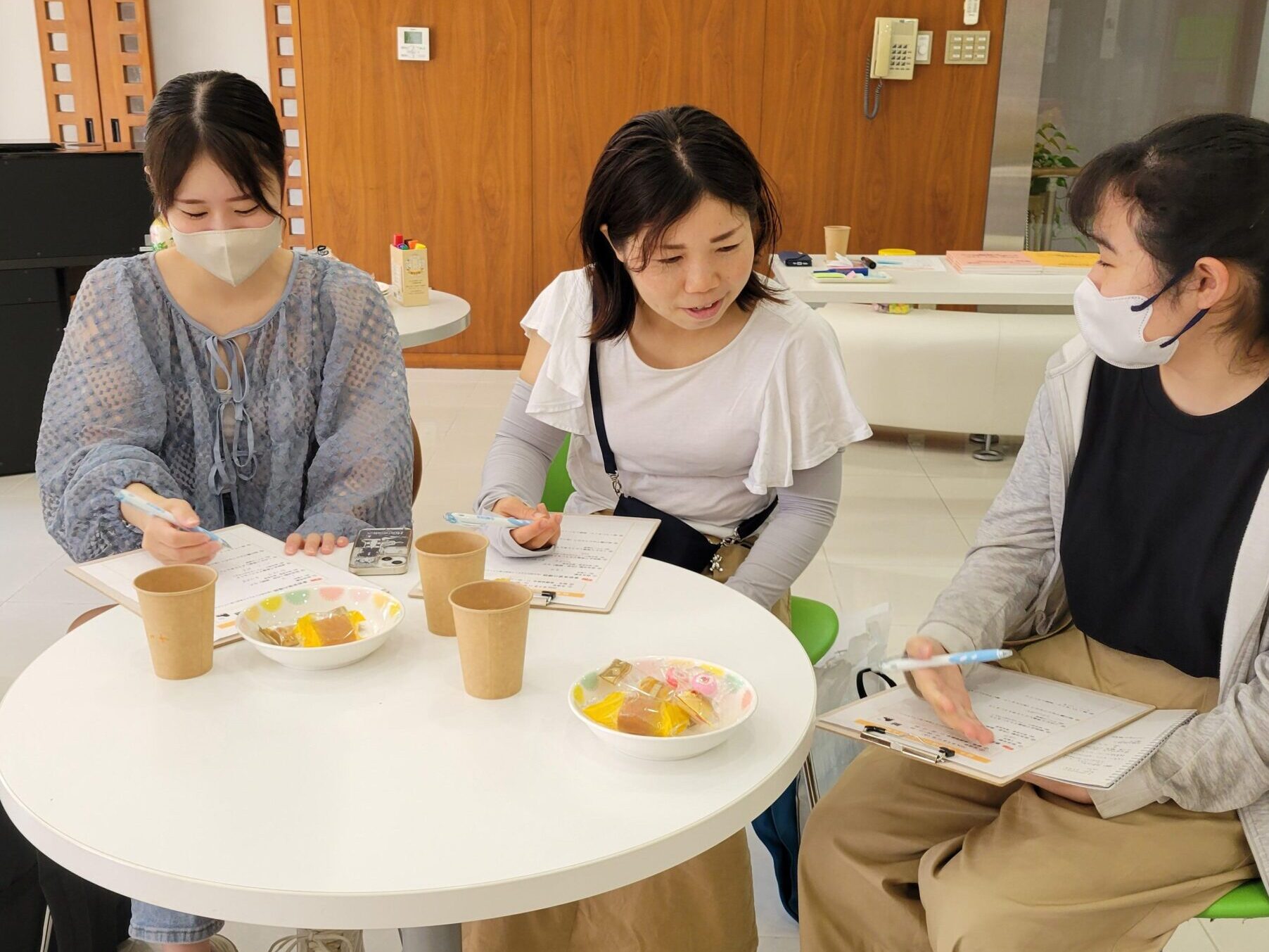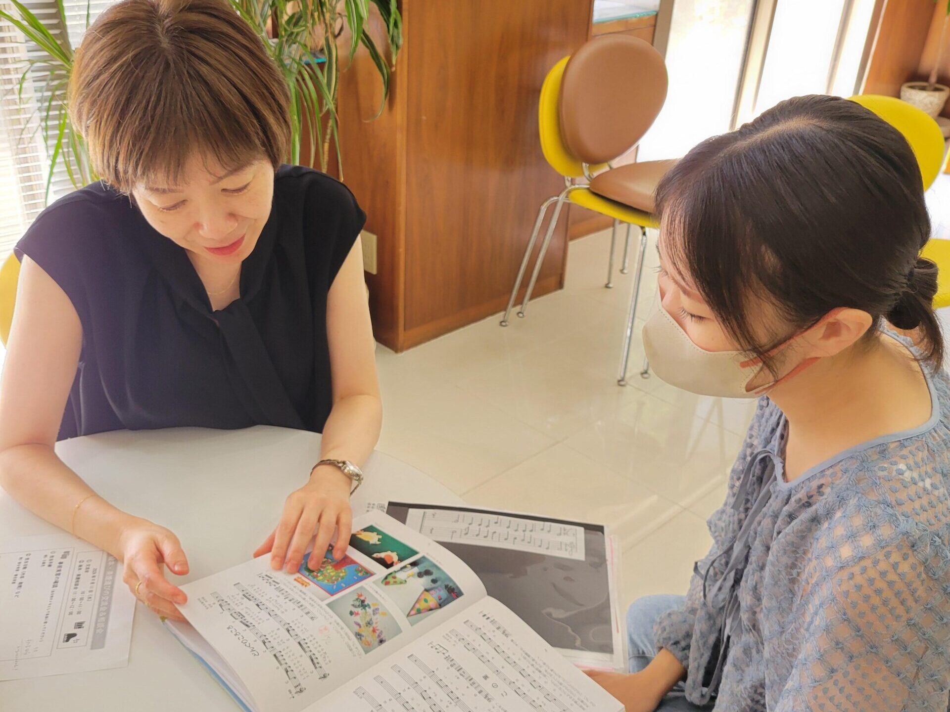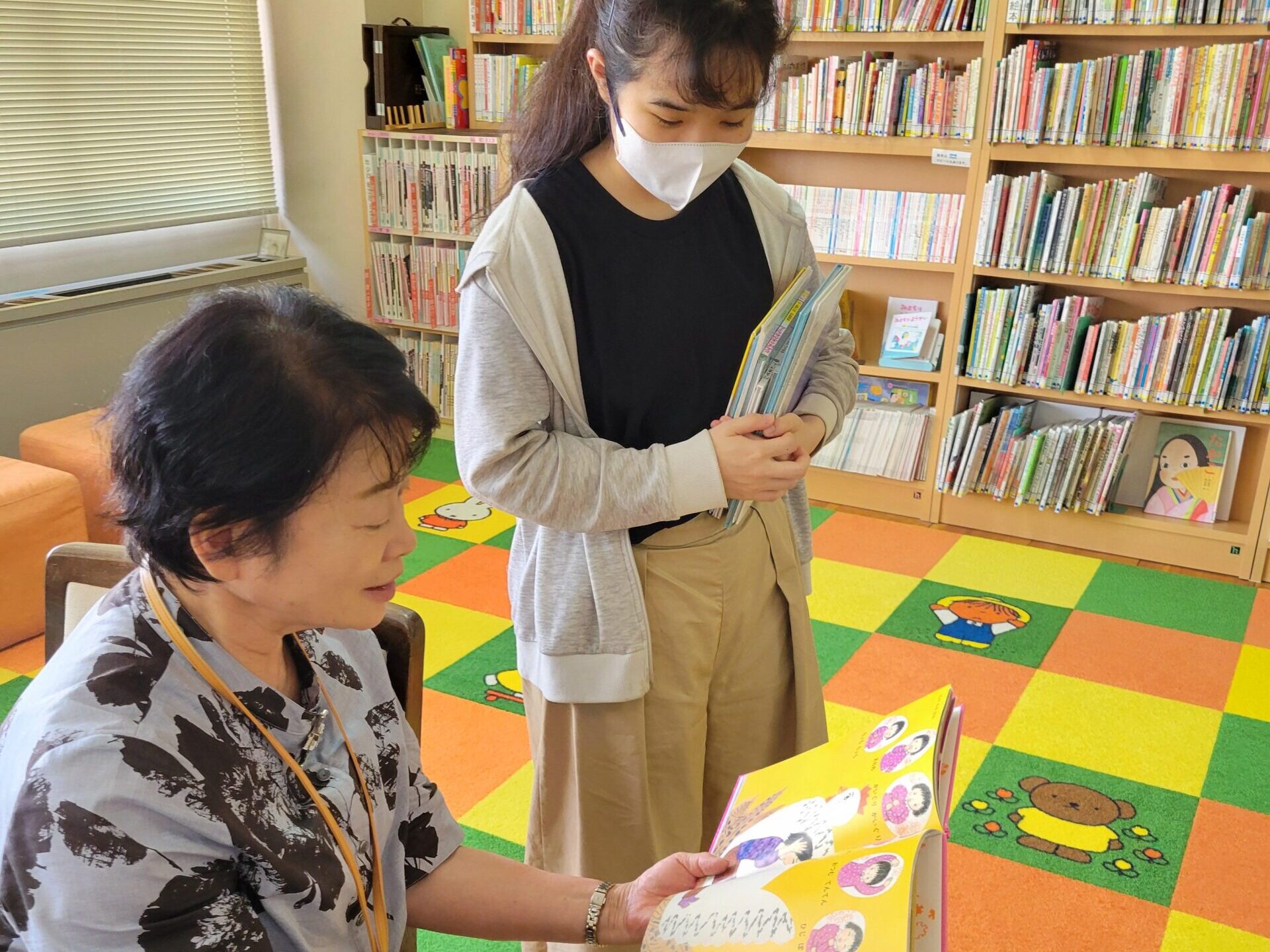 図書館主催の「絵本や楽譜選びの相談会&交流会」が行われました。参加者たちはお茶を飲みながら、リラックスした雰囲気の中実習前に必要な絵本や楽譜の選び方や、絵本の読み聞かせや指導案の準備、さらにはピアノの伴奏に役立つ楽譜の選び方について月齢や活動にあわせた絵本や楽譜について話し合いました。