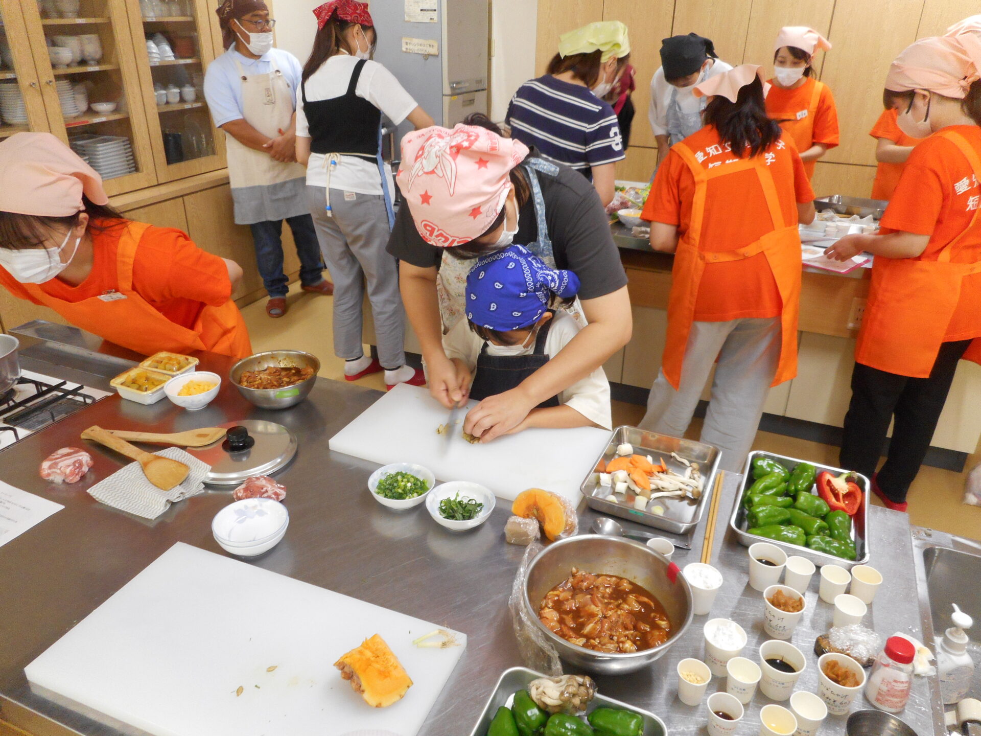 9月14日、清須市総合福祉センターにて「清須市地産地消料理教室」が開催され、食物栄養専攻2年生の「食育実践演習」を選択している学生と、有尾ゼミの学生が実習サポートとして参加しました。