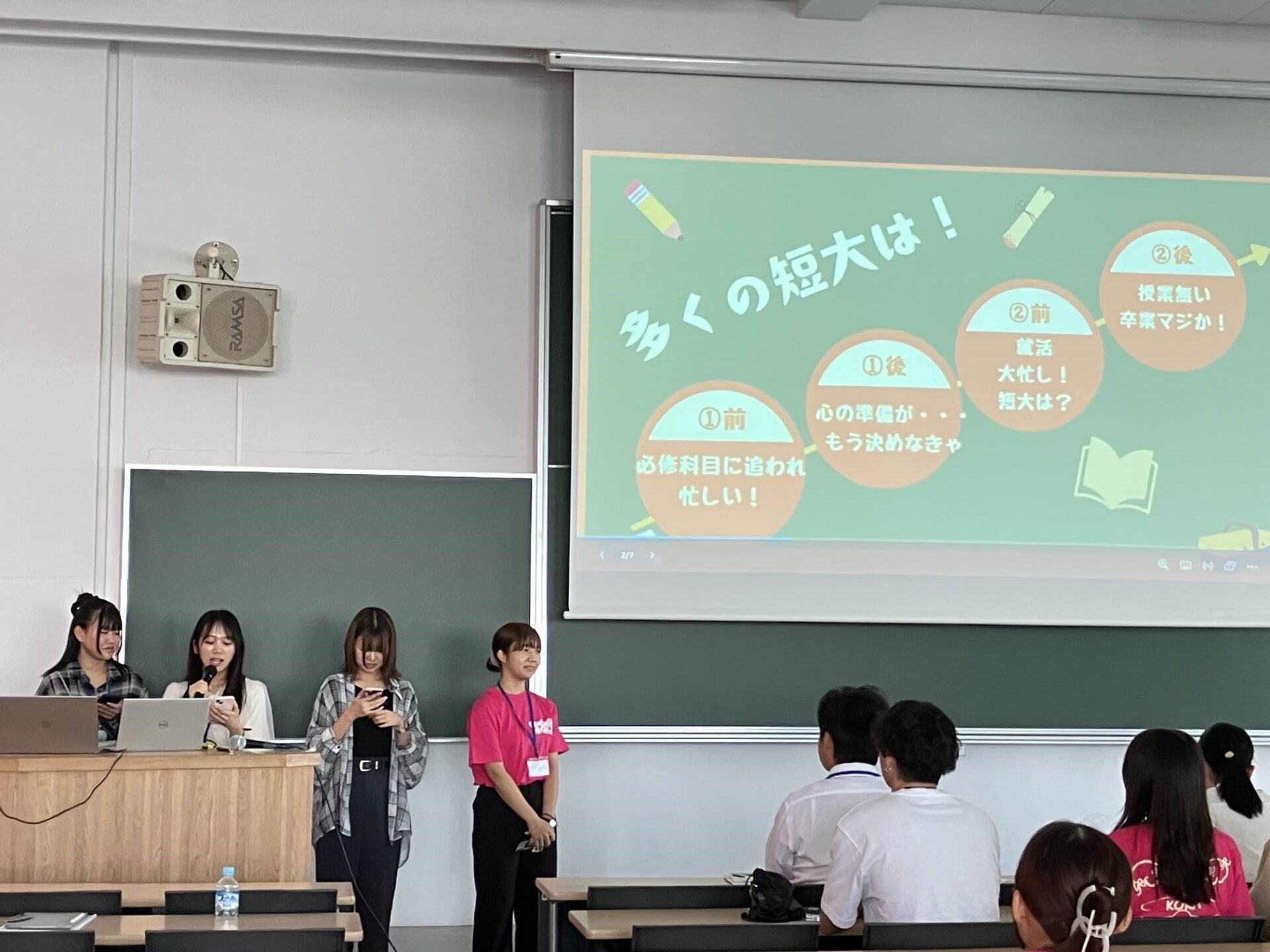 今年度は、「『創』~危機なんやったら創ったらえぇんちゃう?~」をテーマに、18歳人口の減少等を背景に短大の危機が叫ばれる中、ならば自分たちで理想の短大を創ってみよう、ということで様々な角度から新しい短大を「創る」をテーマにしたグループワークを学生・教職員協働で行いました。各グループからは、短大アプリの開発やポイント制導入、企業や地域とのコラボレーションなど、様々な提案がありました。