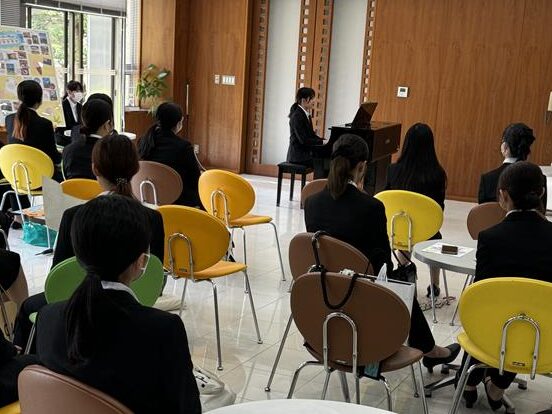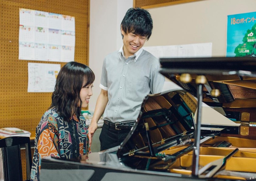 『子ども音楽』という授業では、保育の現場で必要とされるピアノの技術や弾き歌い、コード伴奏、初見演奏などを重点的に学んでいきます。1クラス7~8名の少人数グループで、それぞれのレベルや個性に合わせた個別指導を行っています。そして、就職試験を想定した発表会も行い、実践力や応用力を磨いていきます。授業を通じて、ピアノを楽しく弾きながら、子どもたちとのふれあいを深めていくためのスキルが自然と身についていきます。