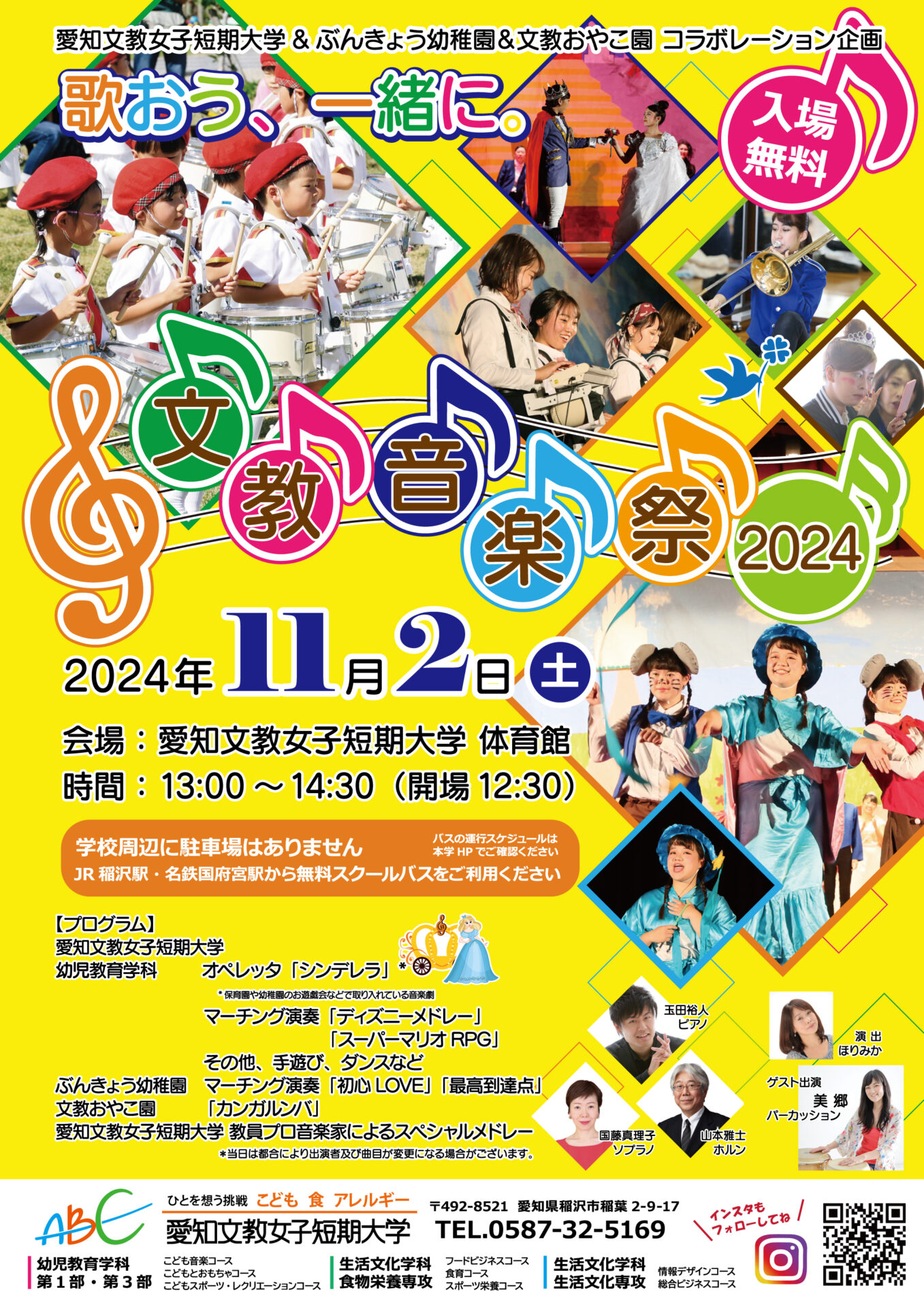 文教音楽祭では、ぶんきょうおやこ園に通う未就園児の子どもたちが踊り、ぶんきょう幼稚園の年長組の元気いっぱいのマーチングのほか、学生によるマーチング演奏や合唱、オペレッタなどが披露されます。更に、特別ステージとして、本学の音楽教員とゲストのパーカッショニストの美郷さんによるプロフェッショナルな演奏も予定しています。文教音楽祭では本学が掲げる「ひとを想う挑戦」を大切にして、子どもたちの生き生きとした姿や、学生のパフォーマンス、子どもから大人までが音楽を楽しみ、素敵なひとときをみんなで一緒に過ごしたいと思います。みんなで音楽を楽しみましょう♪