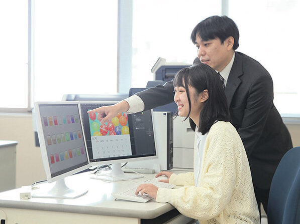 生活文化専攻では、「情報デザイン」と「総合ビジネス」という2つの学びの道が用意されており、その中で砂田先生は主に「情報デザイン」を教えています。未来志向のこの分野では、デジタル技術を駆使し、情報の整理や視覚的な表現を通じて、ユーザーに分かりやすい形で伝える手法を学びます。砂田先生自身も、この「情報デザイン」における最先端の研究を進めており、日々新たな発見を追求しています。