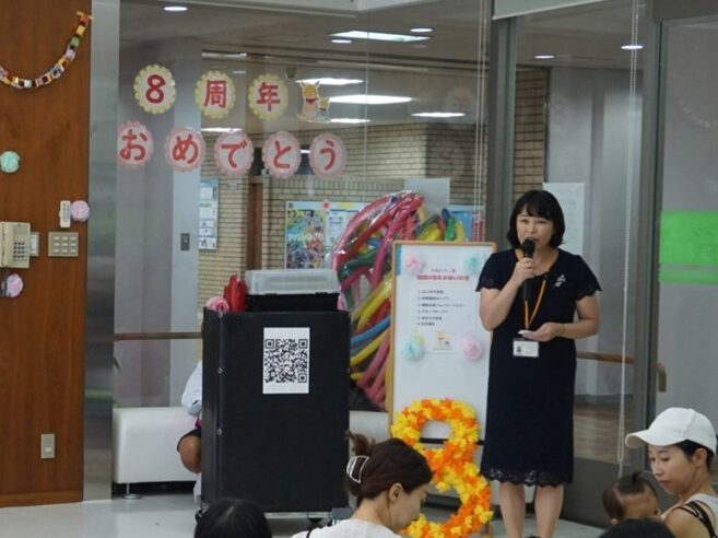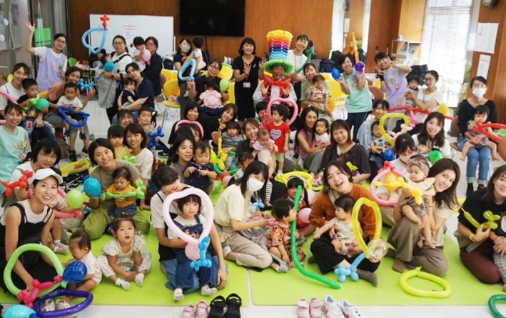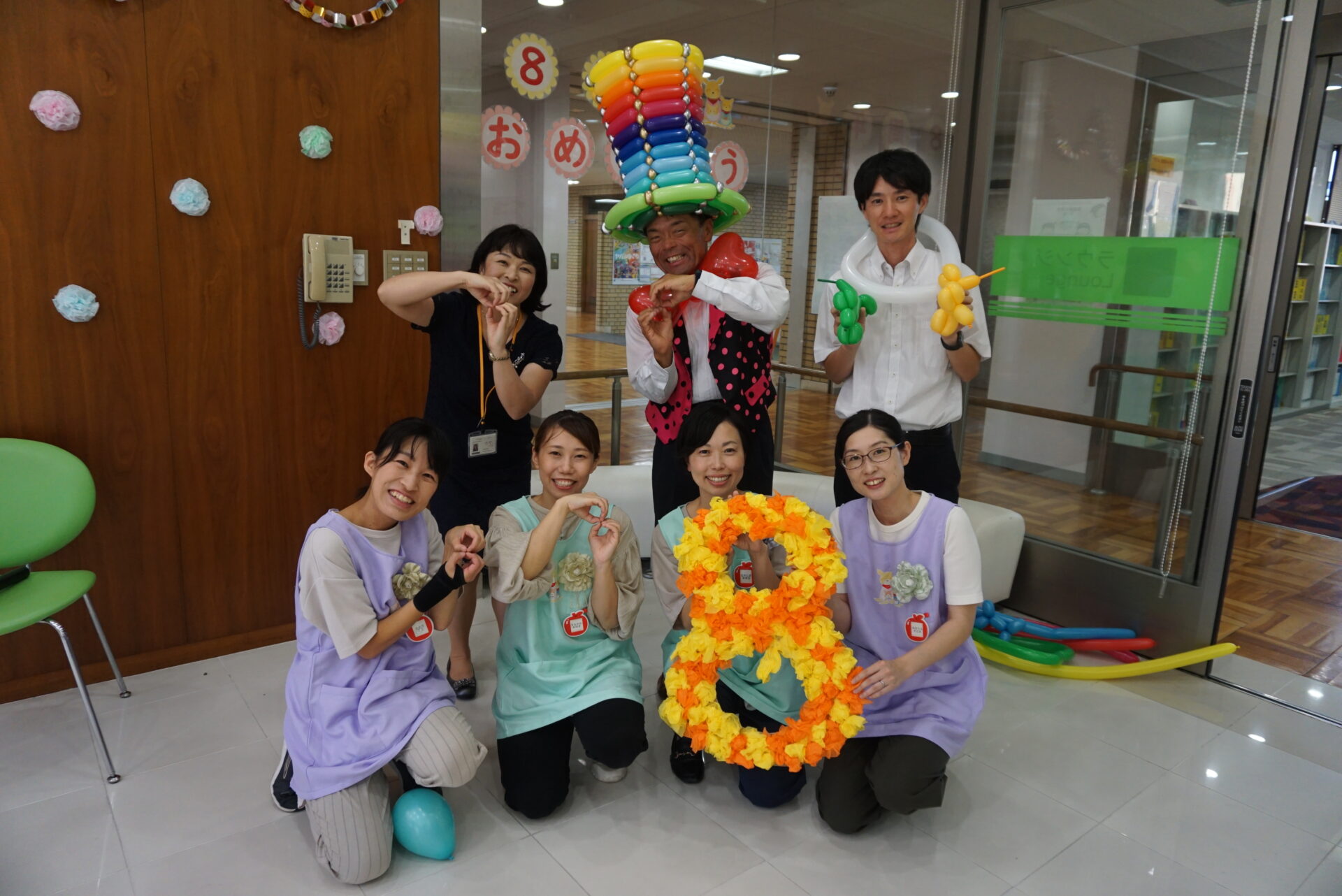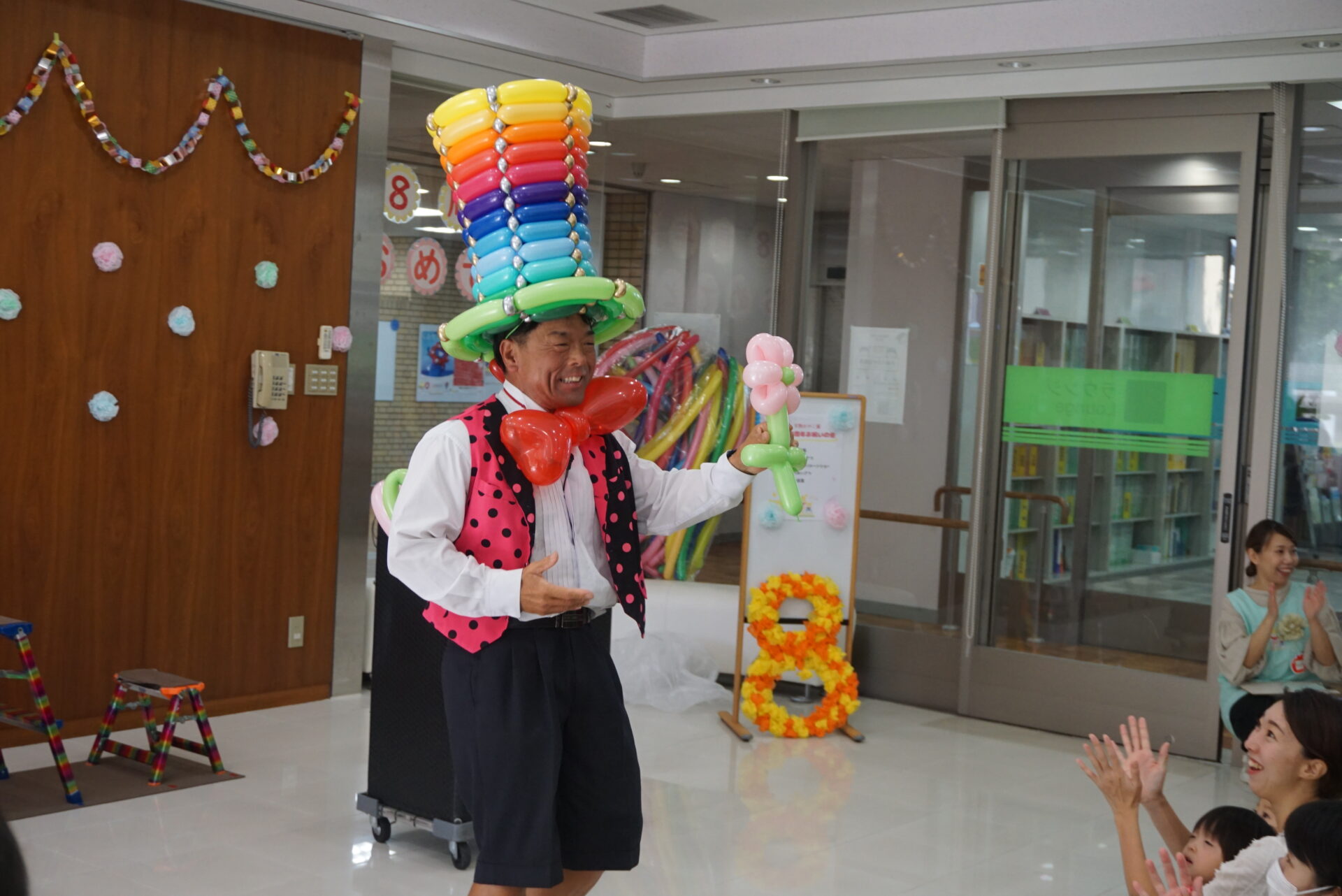 皆様のあたたかいご支援やご協力のおかげで、学内に併設する子育て支援センター「文教おやこ園」が、開園8周年を迎えることができました。この特別な日を祝うために、学内のラウンジで『風船太郎バルーンショー』が開催されました。