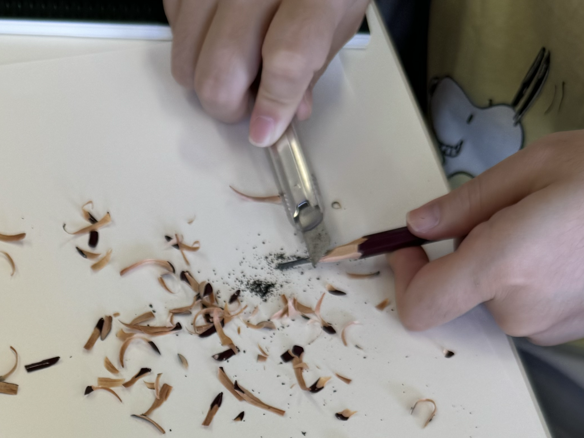 初回の授業では、まず「デッサン」の基本である鉛筆の削り方からスタート。「鉛筆の削り方?」と思うかもしれませんが、ここが重要なポイントの1つ。通常の鉛筆削りではなく、カッターナイフを使って芯を長く削ることが求められます。芯を長く出すことで、鉛筆の感触や描き心地をより繊細にコントロールできるようになります。最初はカッターナイフで削る作業に苦戦する学生もいましたが、次第にコツをつかみ、少しずつ上手に削れるようになっていきました。