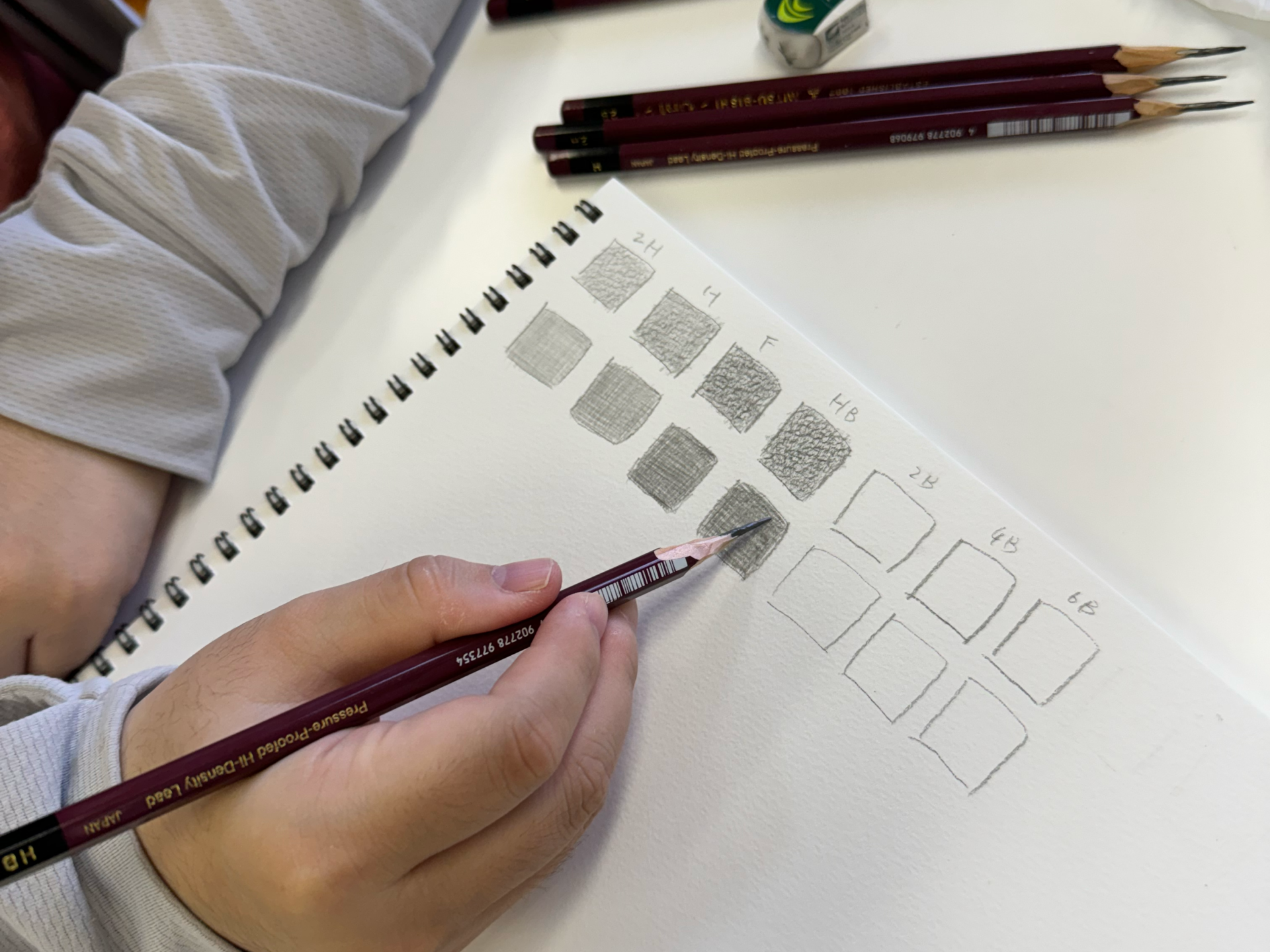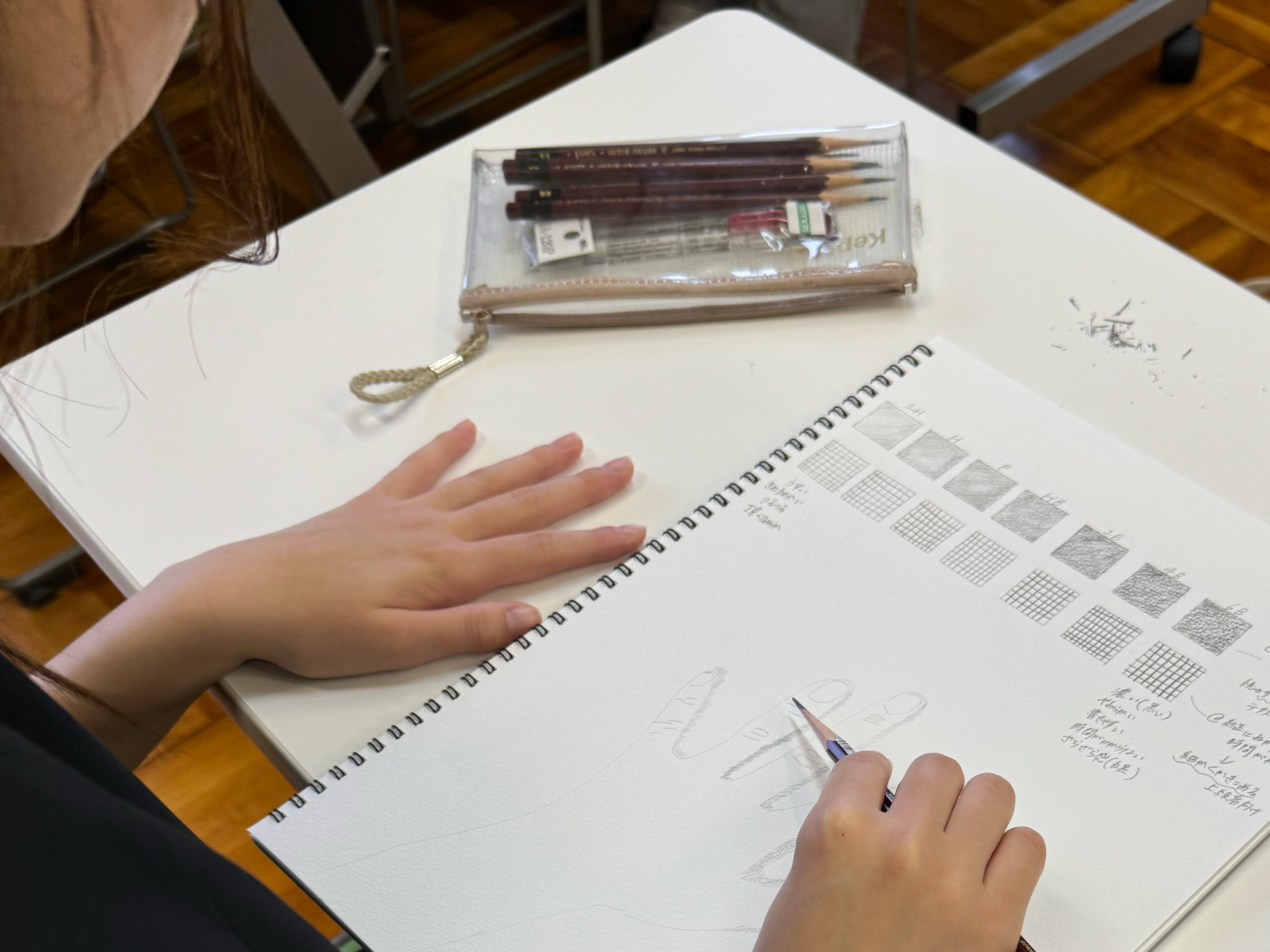 削った鉛筆を使って、次にクロッキーを行いました。正方形のマス目を塗りつぶしながら、鉛筆の濃淡や感触を確認していきます。使用する鉛筆は、2Hから6Bまでの幅広い種類があり、硬いものから柔らかいものまで試して、手の感覚で違いを感じ取りました。
