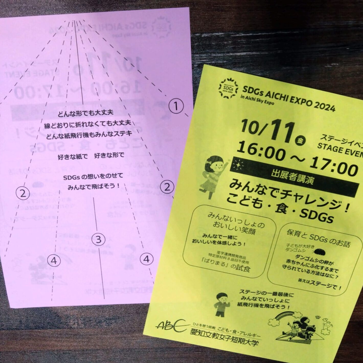 今年は、10月11日(金)16時~17時に、みんなでチャレンジ!「こども・食・SDGs」のステージイベントも行います。ステージの最後には、来場者の方と一緒に紙飛行機を折り、SDGsの思いをのせて飛ばします。ステージの様子は、SDGs AICHI EXPO 2024 オンライン開催のYouTubeで視聴可能ですので、2日目の最後のステージをぜひご覧ください。