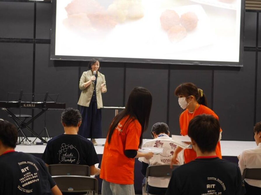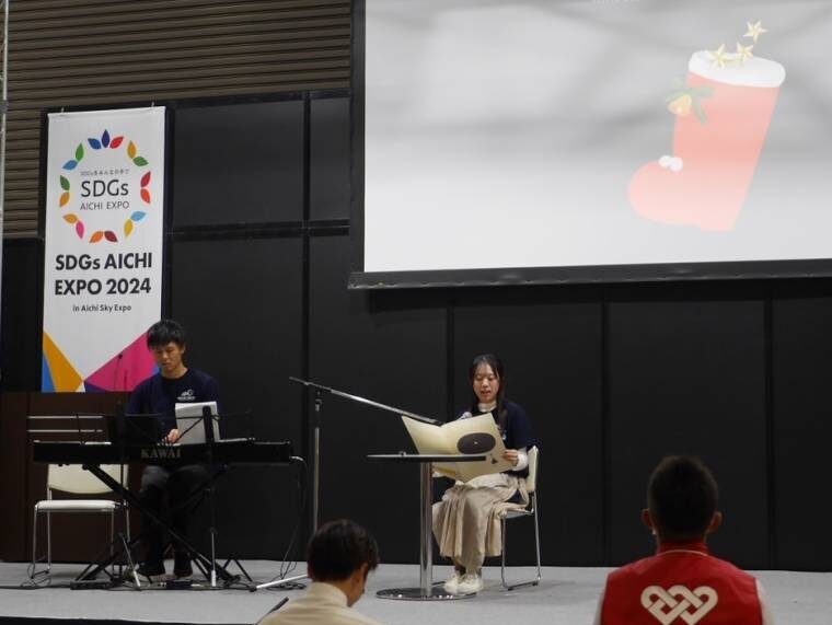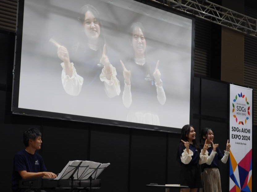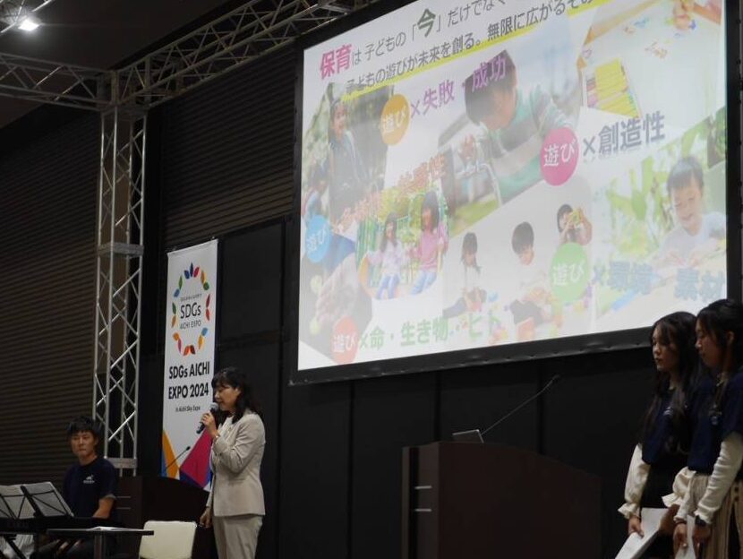 「SDGs AICHI EXPO 2024」のステージイベントで、幼児教育学科の教員や学生たちが登場し、「こども・食・SDGs」をテーマに、日常の保育生活に根付くSDGsの取り組みを紹介しました。