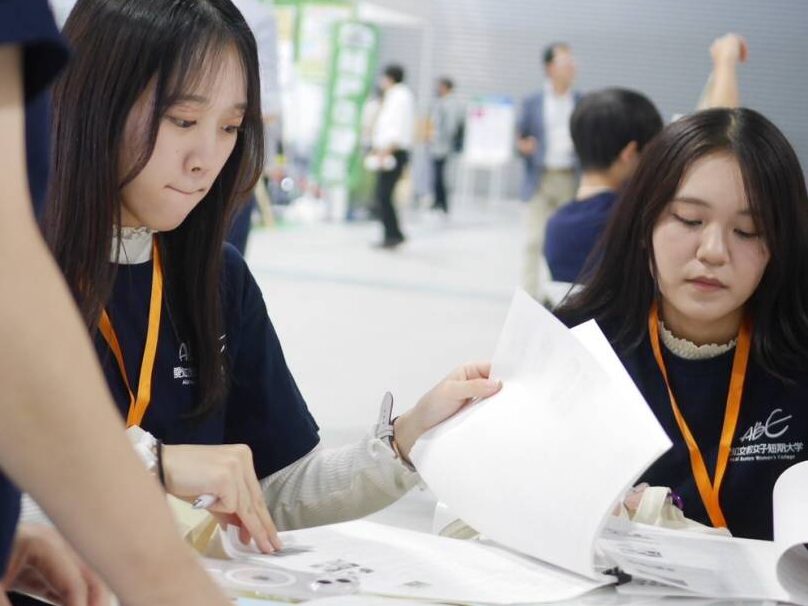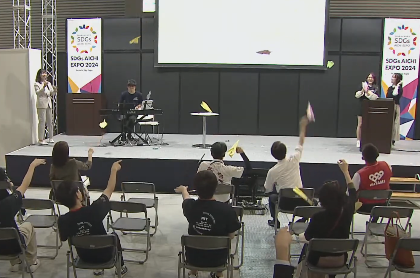 ステージの最後には、みんなで紙飛行機を折り、スクリーンの青空に向かってSDGsへの願いを込めて飛ばしました。会場全体が一体となり、素敵なステージとなりました。生活文化学科の学生が来場者の方々に声をかけて客席に案内し、幼児教育学科の学生たちは自分たちのできることを精一杯発揮。学科の枠を超えた学生たちの協力で温かな雰囲気に包まれたステージなりました。