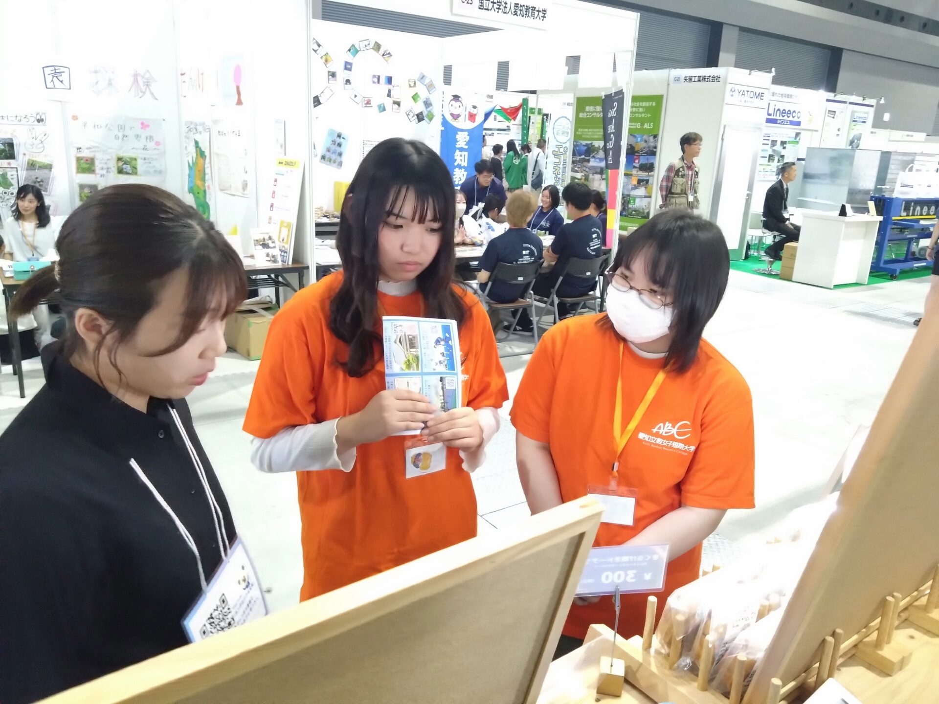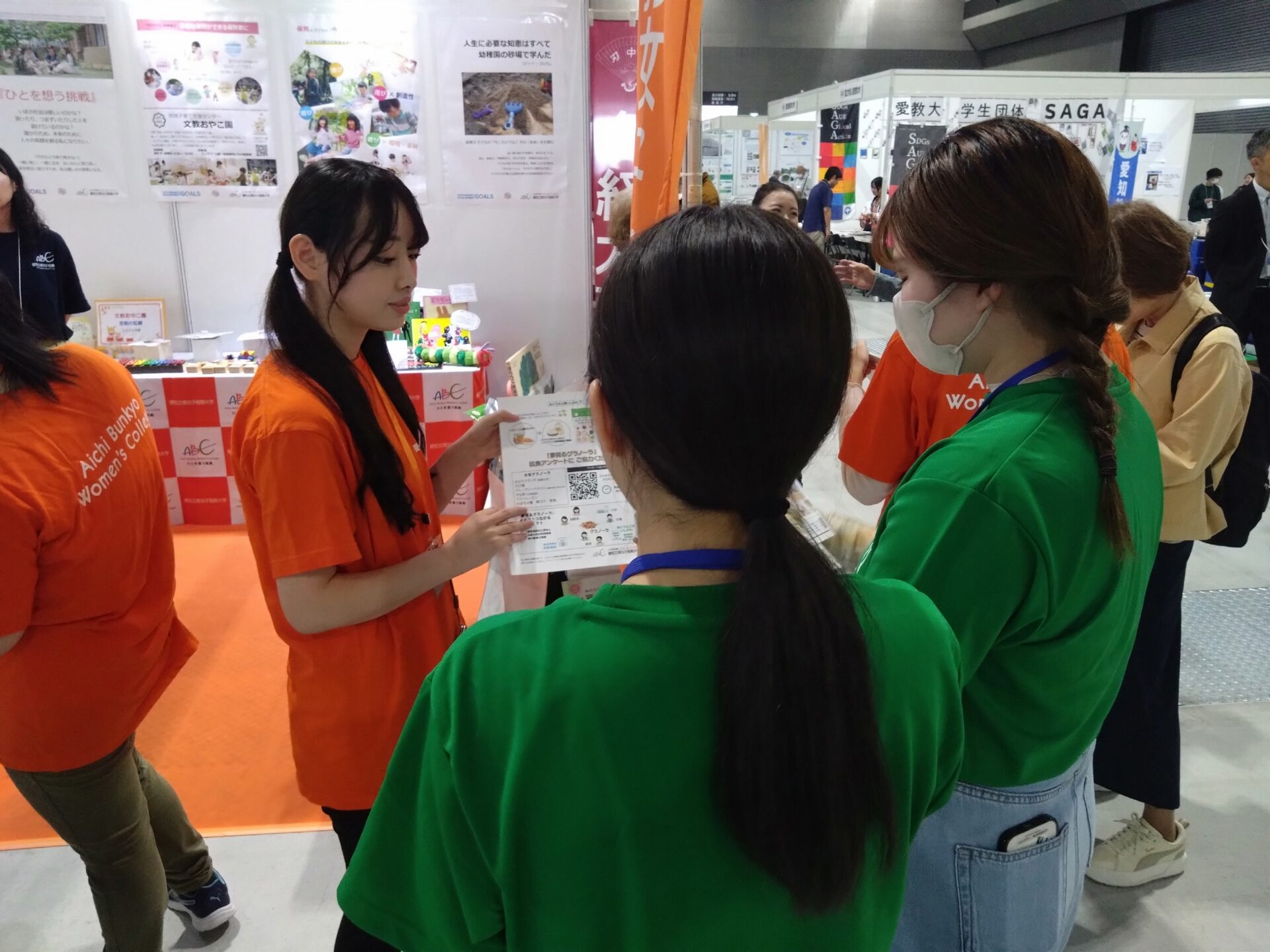 生活文化専攻の2年生は、紺色のTシャツで取り組みを説明。昨年に引き続き2年目ということもあり、昨年ブースで声をかけていただいた方にも再会し、今年の取り組みをPR。