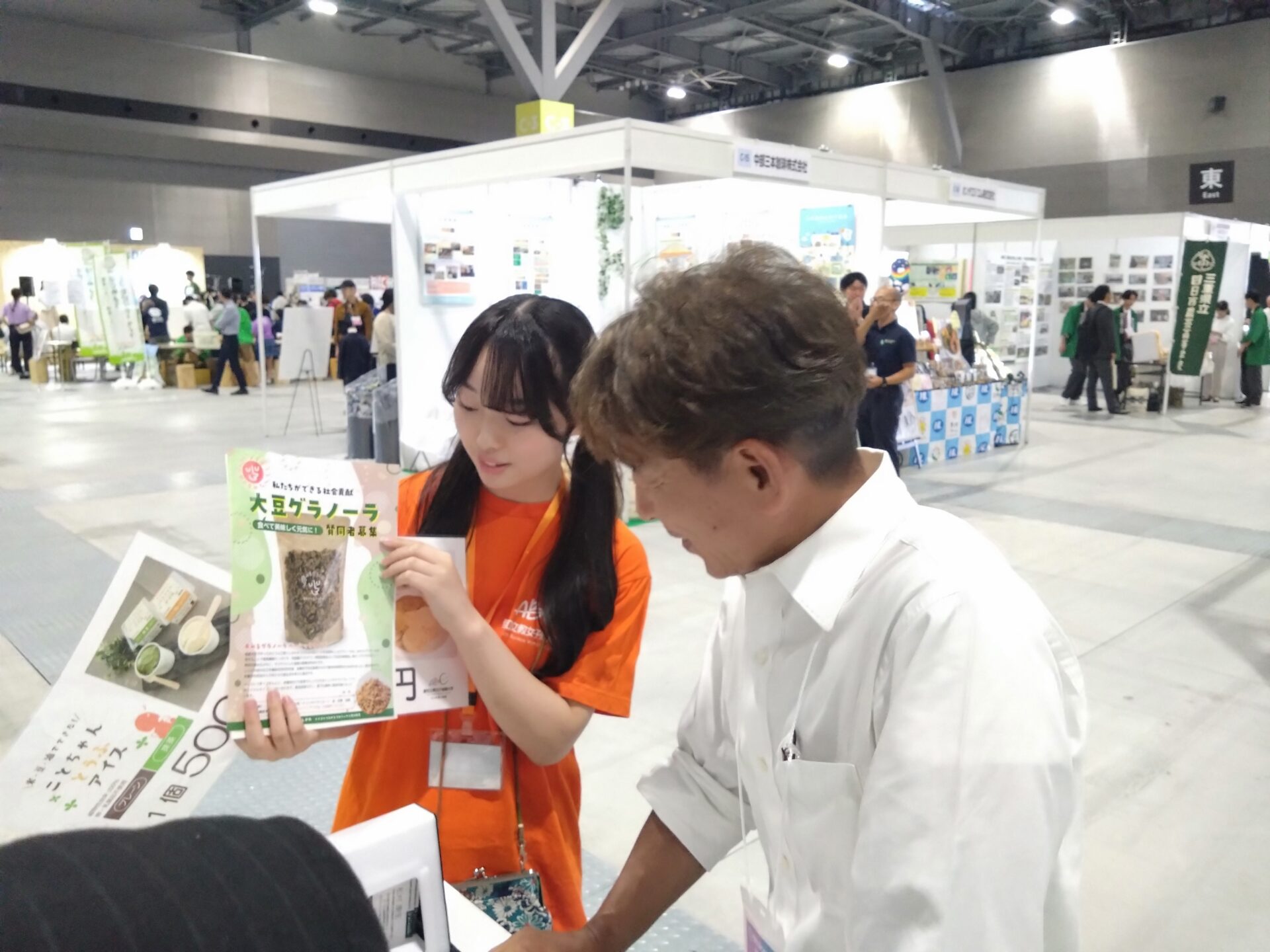 富田学長もブースに来ていただけました。試食アンケートの趣旨説明をしながら、これから産官学連携で取り組む、夢見るグラノーラのプロジェクトもしっかり説明することができました。