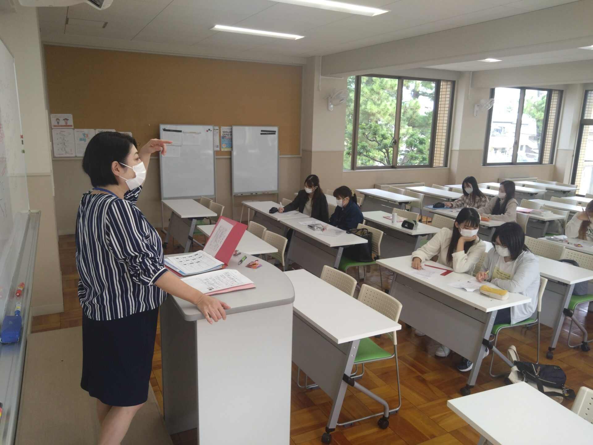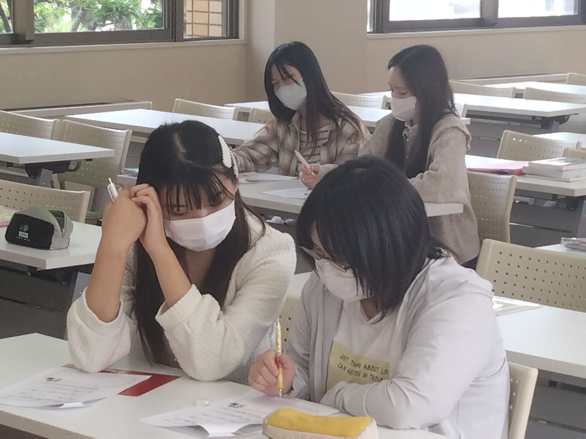 今日の授業は、ホテルのコンシェルジュになり、お客様からの無理難題に適切な柔軟性、臨機応変で、また泊まりたい。泊まってよかったと思ってもらえるには、どうしたいかをペアワークで考えました。様々なシーンを想定し、リクエストに対してどうしたらよいか、要望にプラスした心遣いを考えました。断るケースを考えるチームもあり、ただ断るだけではなく、何か違うことができないかと、想像しながら、自分たちなりの対応を考えました。