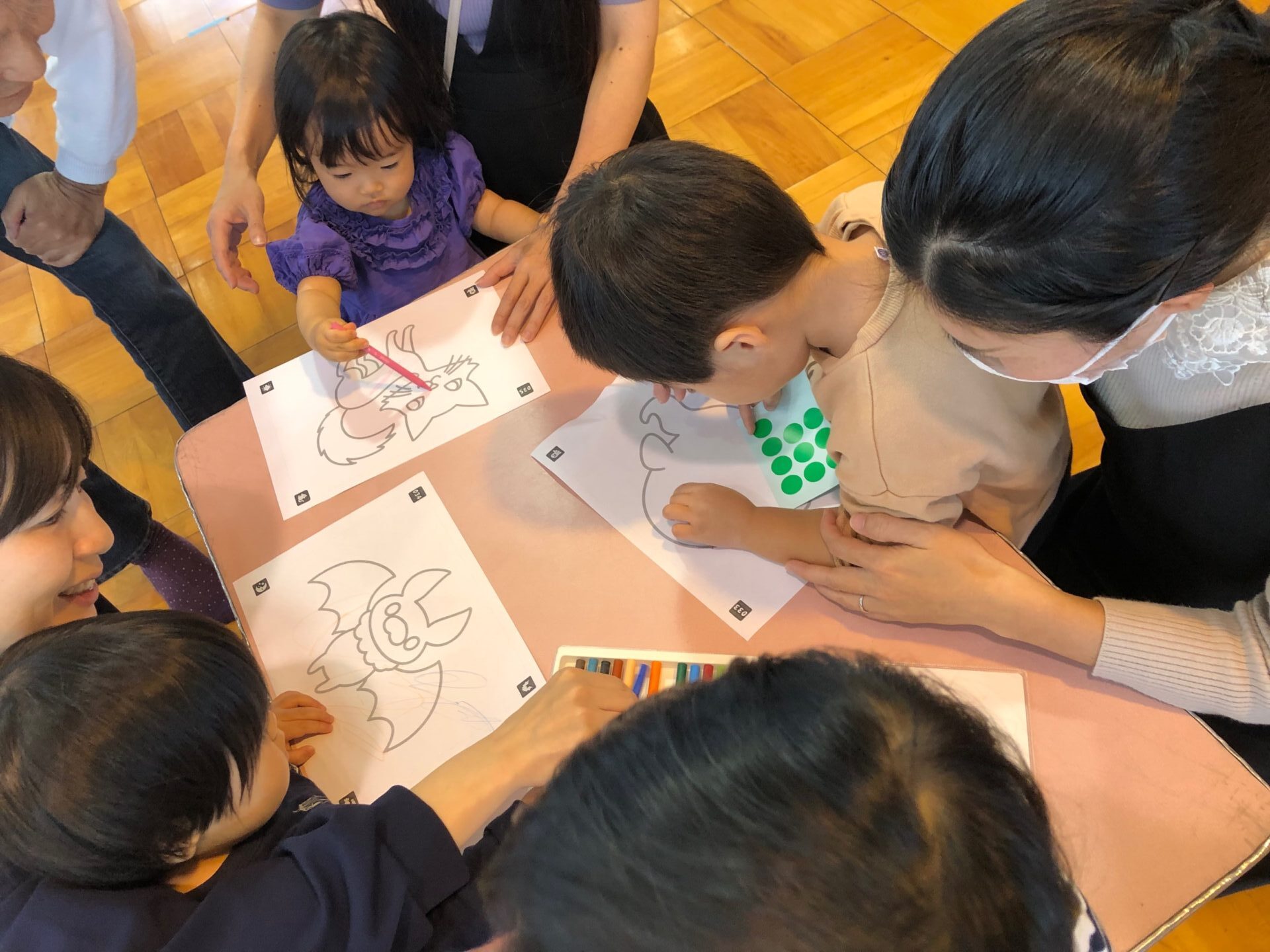 今回のイベントには、幼稚園入園前の小さなお子さんたちがたくさん集まり、楽しそうに遊ぶ姿が見られました。このイベントでは、来年から本学で始まる「こどもICT」の授業で学ぶ内容を、少し早めに子どもたちに体験してもらうという特別な内容でした。最新のあそびツールを通して、子どもたちの作品がスクリーン上で動き出すという、まるで魔法のような体験ができるプログラムです。お絵かきやシール貼りをした作品が動き出す様子に、子どもたちもお母さんたちも思わず歓声を上げていました!