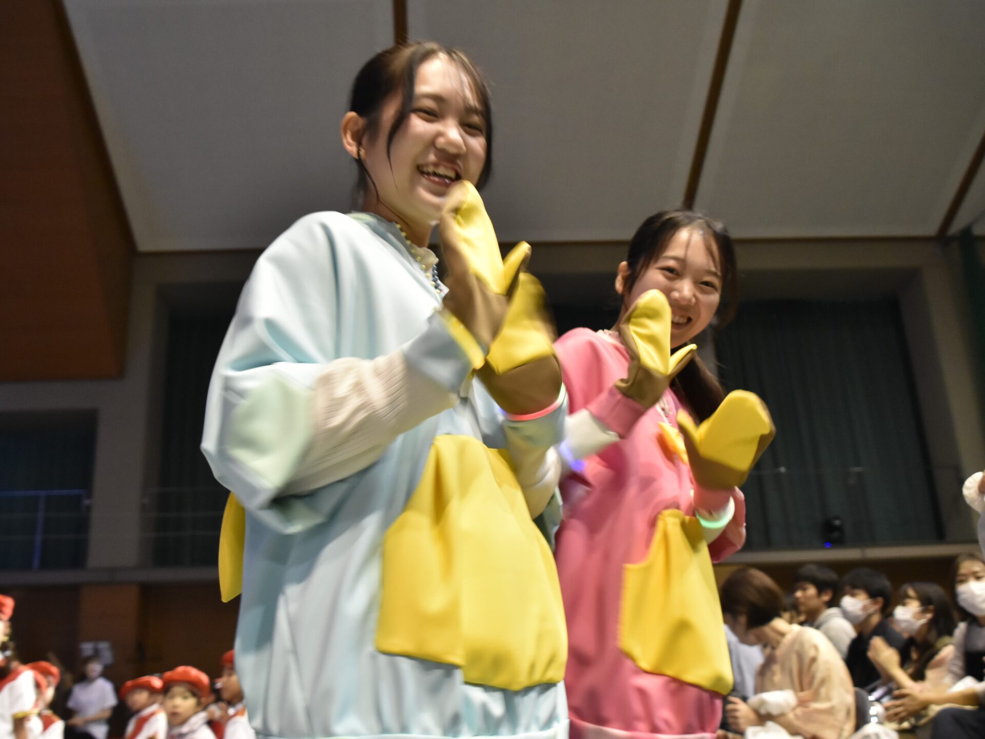 『カンガルンバ』は、日ごろの活動で親しんでいるダンスということもあり、文教おやこ園の小さな子どもたちも、たくさんのお客さんの前で、元気に可愛く踊ることができました。幼児教育学科の学生である「カンガルンバのお姉さん」も子どもたちと楽しくダンスをして盛り上げてくれました。