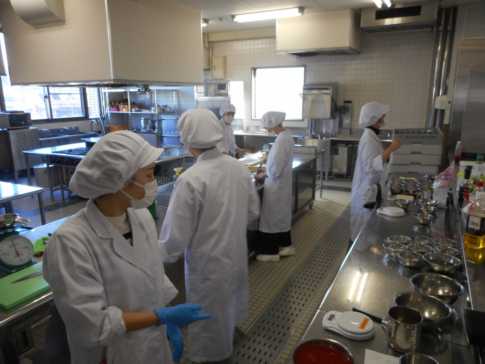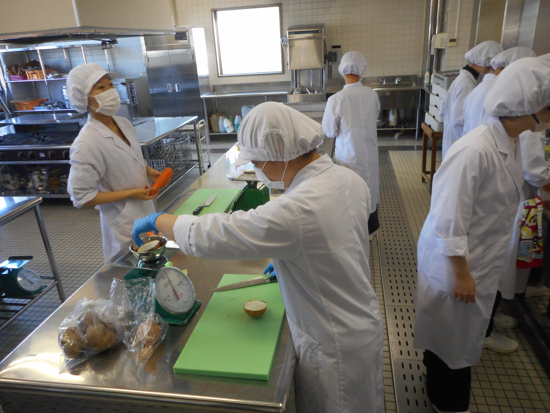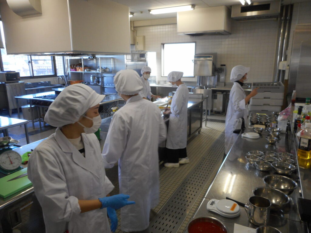 試作会では、委員が中心となり、食材をメニューごとに分配し、スムーズに調理が進むように調味料もあらかじめ計量しておきます。調理は、給食管理実習のグループごとに分かれて行い、作り方を確認しながら進めます。