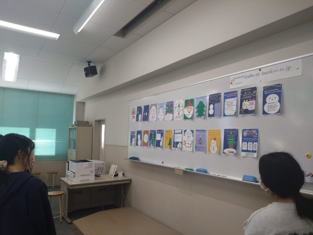 ポストカードは、クリスマスツリーにオーナメントのように飾りつけ、参加者へのプレゼントとして配られるため、学生たちは、「自分だったらどんなデザインが嬉しいか?」などを想像し、カラフルで楽しいデザインがたくさんできあがりました。