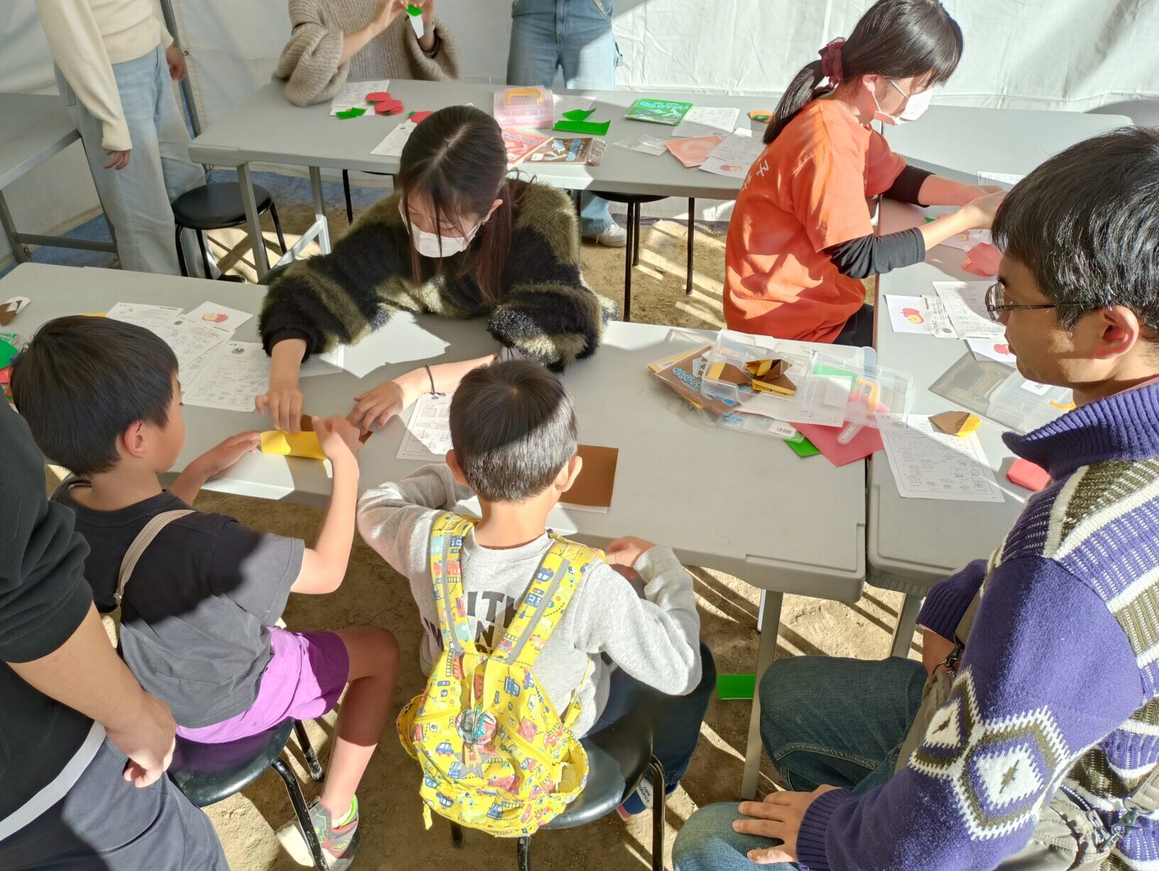 毎年恒例となった「食育おりがみ体験」のブースでは、食材をモチーフにした折り紙の作り方を教え、完成した折り紙作品を通して「食の大切さ」を伝えます。食育おりがみをどう教えたらわかりやすいのか、また、どうやったら食に興味をもってもらえるのかを考え準備を進めました。ブースは、たくさんのこともたちで大盛況。学生たちも参加してくれた方の笑顔に元気をもらいました。