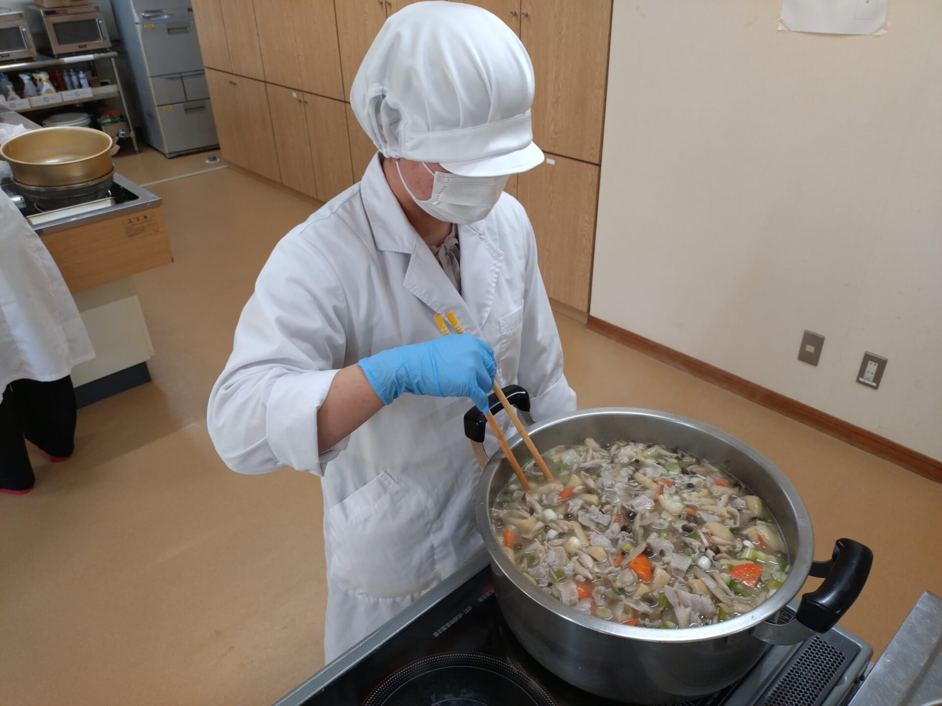 この「とろとろ土田かぼちゃ汁」は、特定原材料等28品目を除いたレシピで調理されており、アレルギーの心配なく楽しめように工夫をしてあります。本学が食物アレルギーについて取り組んでいることにも興味を持っていただいている方も多く、丁寧に説明を行うこともできました。