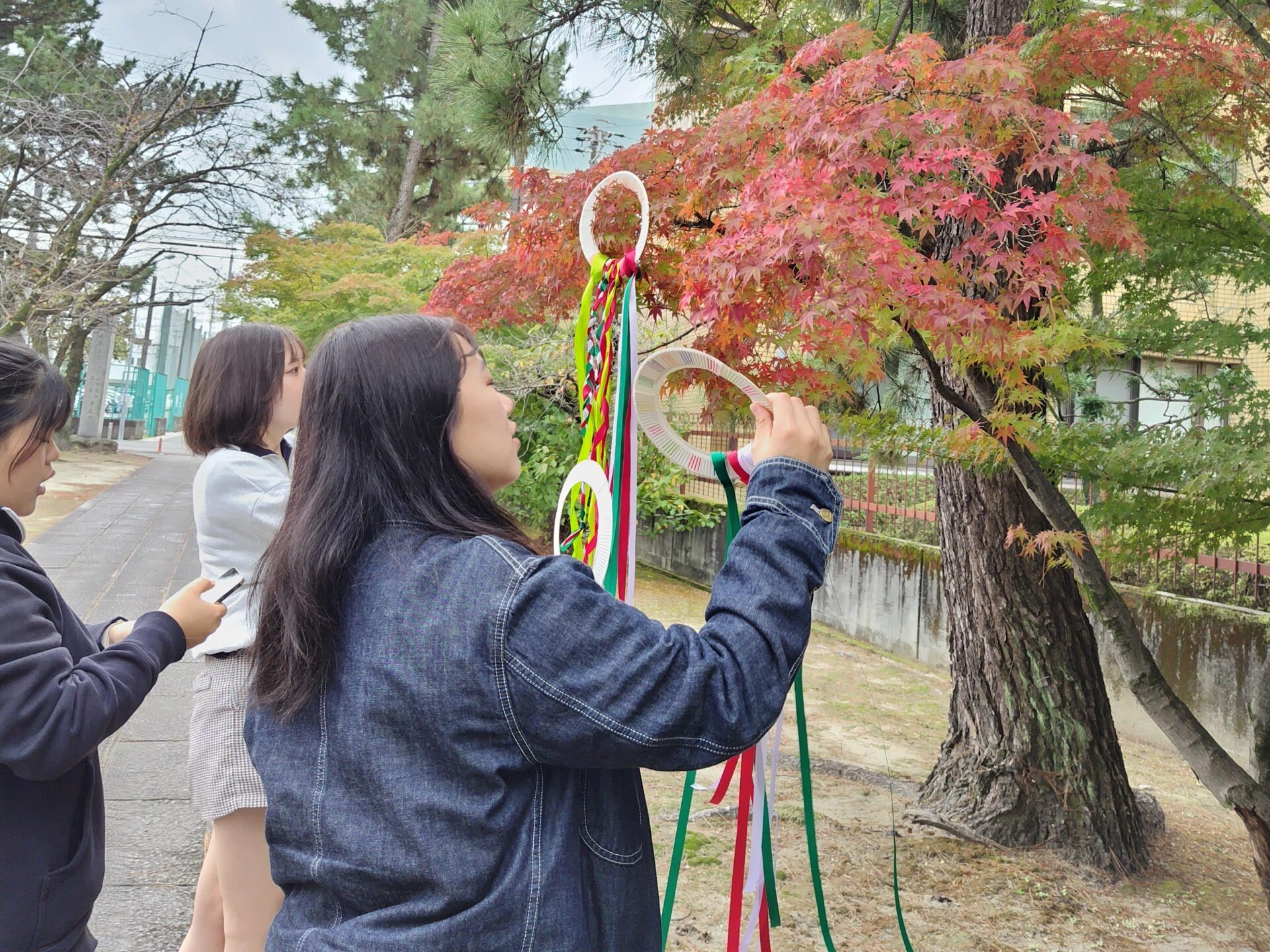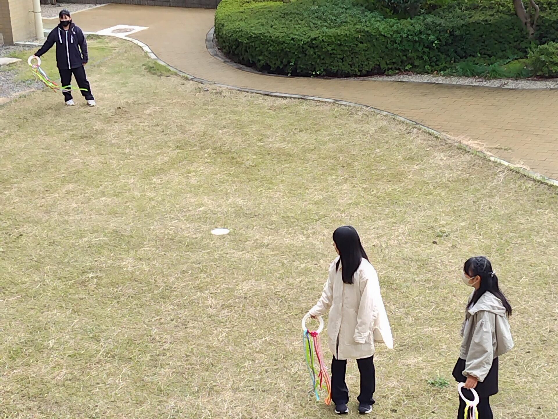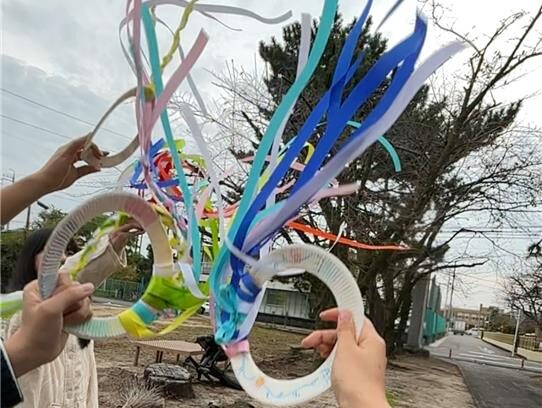 ハンドカイトは、子どもが手に持って、リボンをひらひらとさせながら走って遊ぶおもちゃで、凧あげがまだできない乳児でも楽しめる凧です。子どもの感性を豊かにすることや、自然と親しむことのできる玩具として、保育現場や家庭で取り入れられています。実際には既製品の物が多く使われていますが、今回の授業では、保育現場でも馴染の多い「紙皿とリボン」をつかって手作りハンドカイトを制作しました。