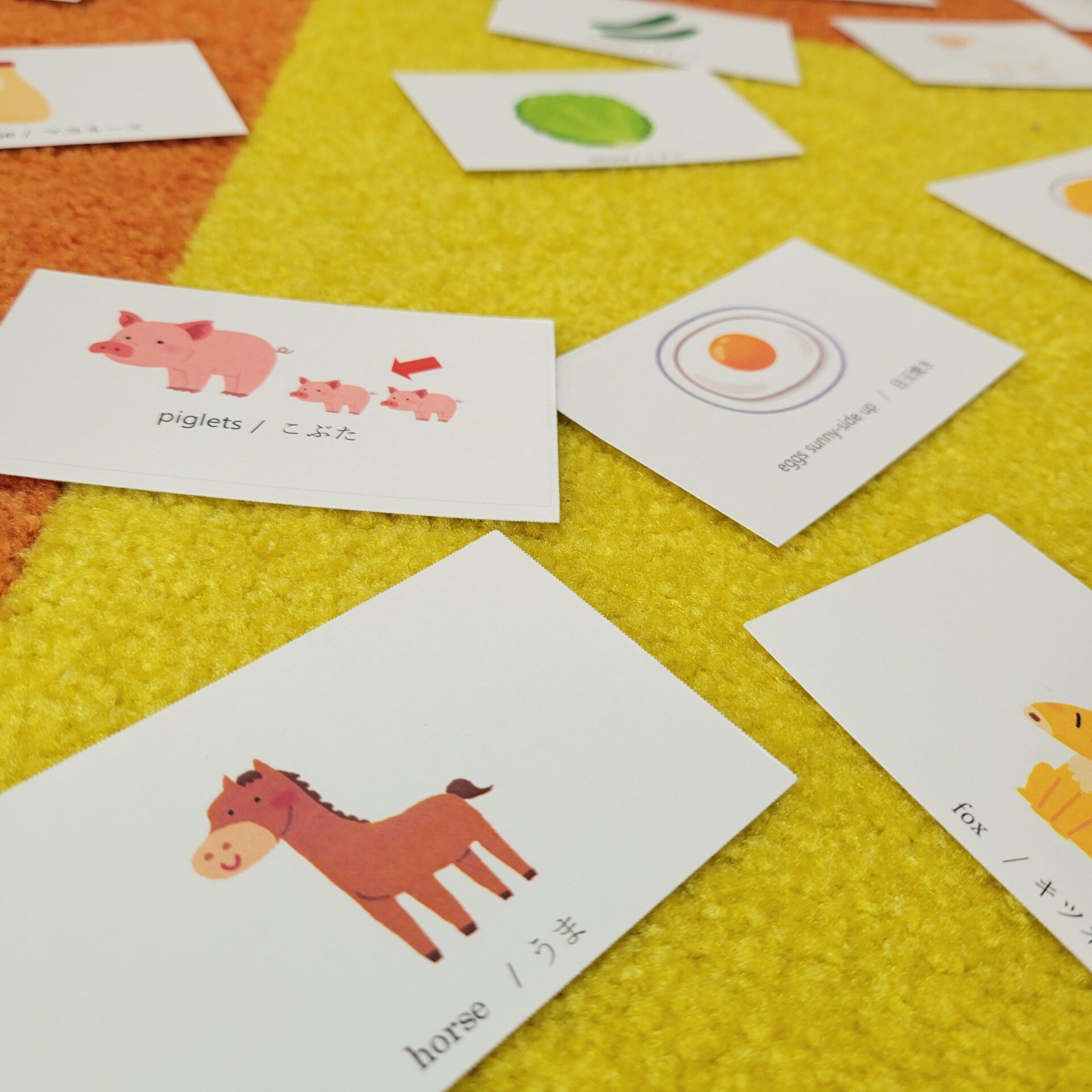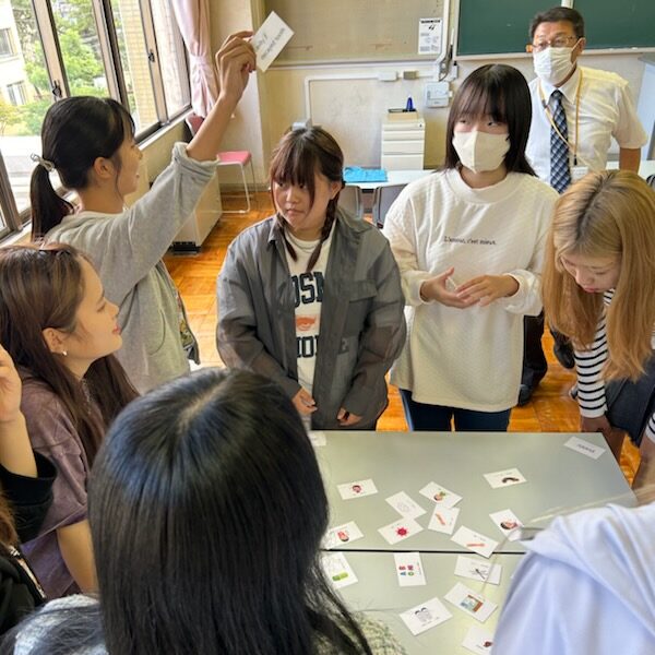 授業で活用される図書館が手作りした「英語かるた」を使った授業は、保育に関連する単語を楽しく覚えられる工夫が満載です。たとえば、おむつ(diaper)やよだれかけ(bib)など、乳幼児に関わる単語をゲーム感覚で覚えられるので、実践的な語彙力を身につけることができます。