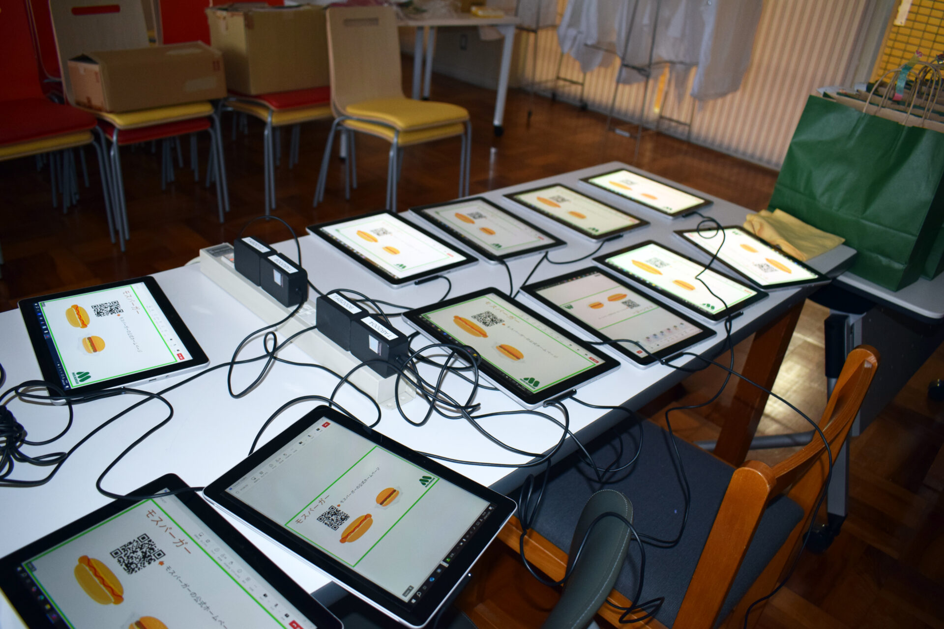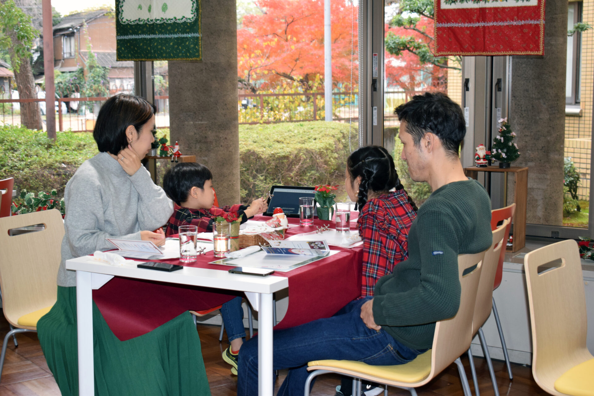 受付を済ませ、食事が始まる前の時間も楽しんでいただこうと、ICT教育演習の授業で「アレルギー対応の企業の取り組み」や「子ども向けのクリスマスのお話」、「食育のお話」のスライドを作成し、各テーブルにタブレットを配置し、自由に見ていただきました。