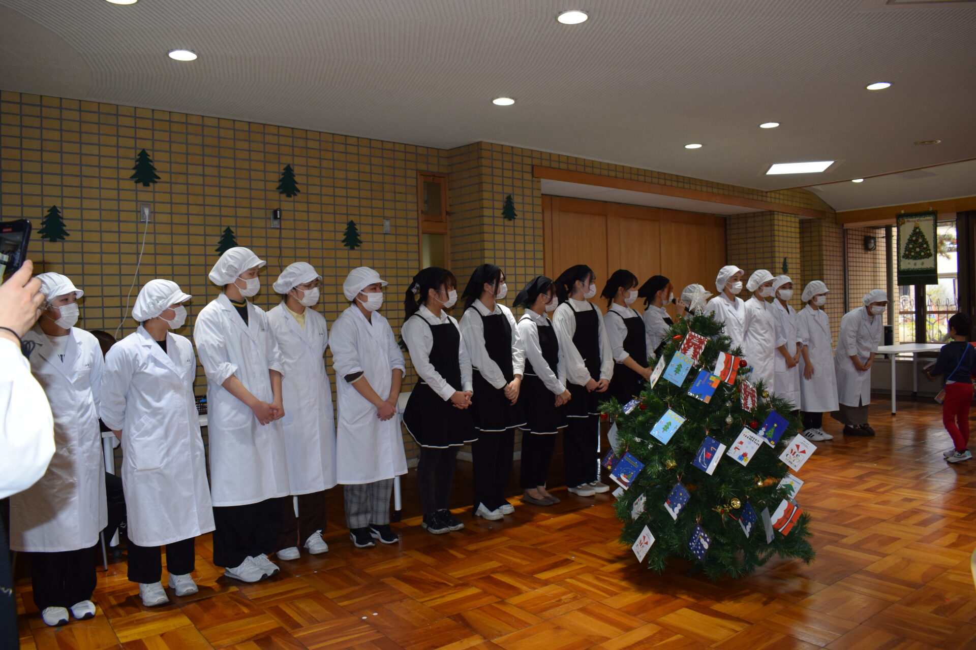 パーティの最後は、全員がホールに並び参加者へ挨拶をしました。たのしい雰囲気のクリスマスパーティーに、「全部食べることができたよ!」「おいしいね!」と、うれしそうな笑顔の親子たちの姿。学生たちも達成感を感じていました。