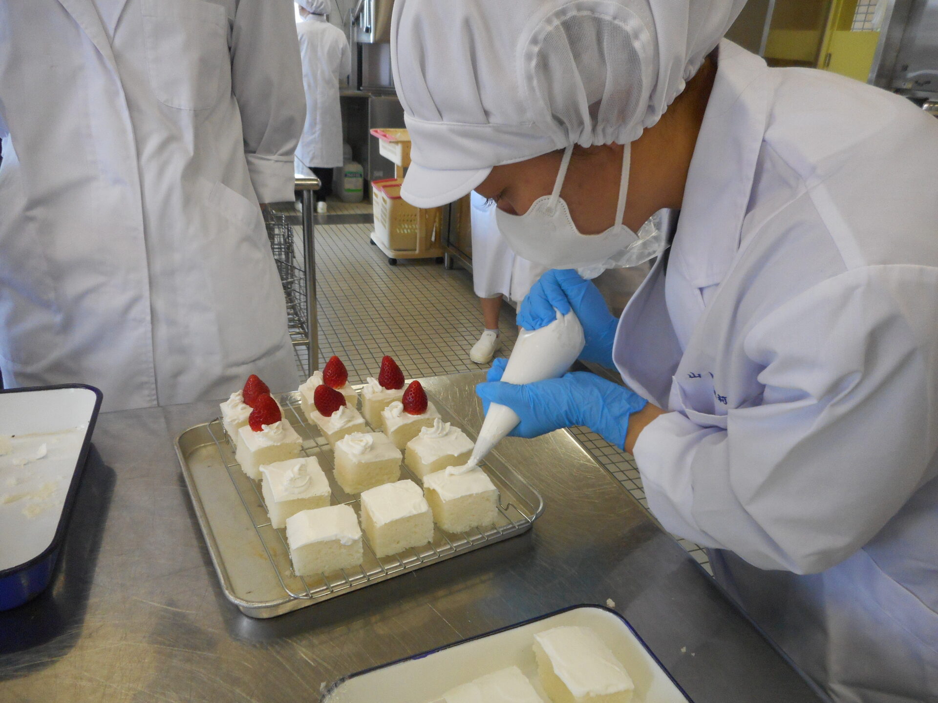 安全なパーティを実施する為に、まず、使用するスペースの清掃から始まります。実習で使用する厨房は、普段小麦・乳・卵を使用しているため器具等に付着している可能性があります。混入を防ぐためにパーティの一週間前に厨房内を入念に清掃します。パーティー会場もクリスマスムードたっぷりに飾り付け、実行委員の学生が清掃箇所の確認など、最終チェックを行います。