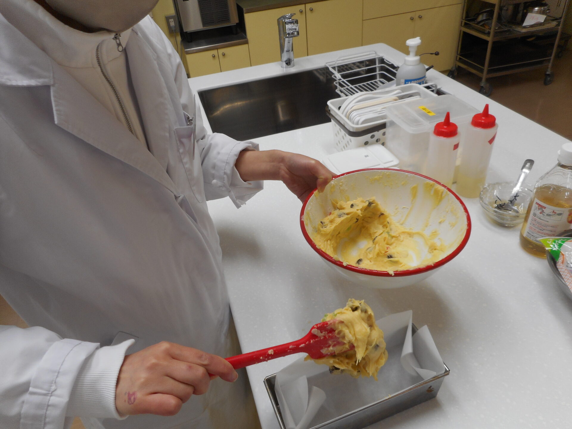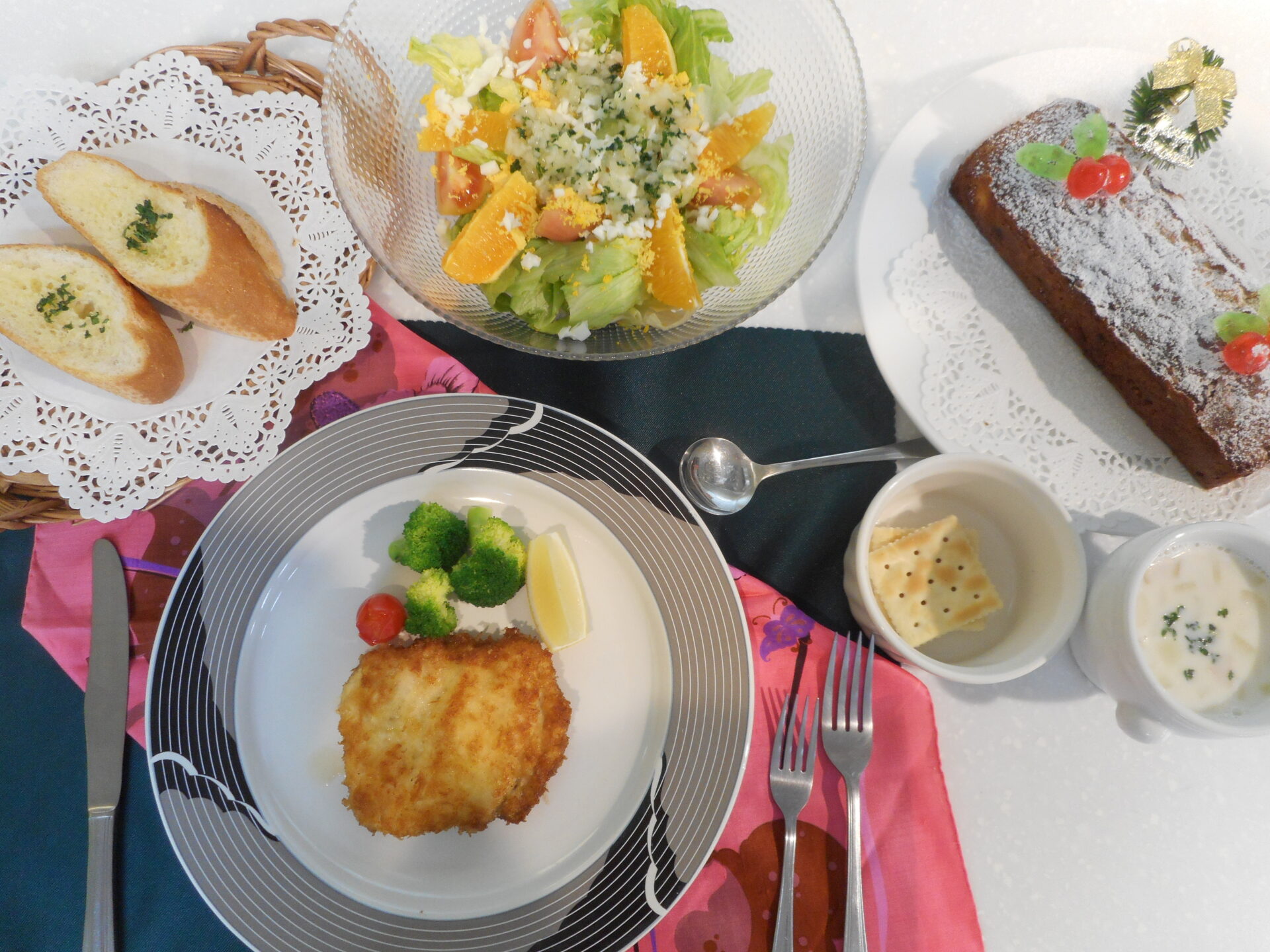 1年後期に開講される「調理学実習Ⅱ」の授業では、西洋料理と中国料理を学びます。今回の実習では、日常のメニューに工夫を加えてクリスマスディナーを作りました。メニューは、チキンカツレツ、ミモザサラダ、クラムチャウダー、ガーリックトースト、パウンドケーキです。