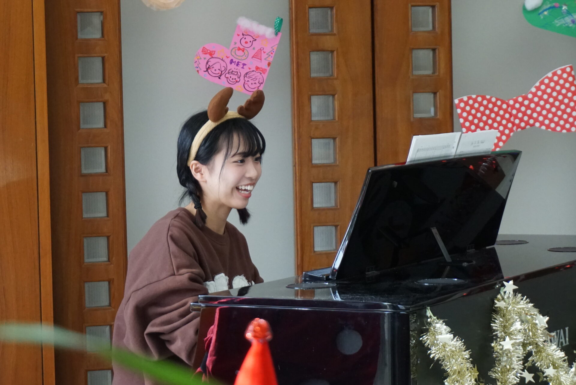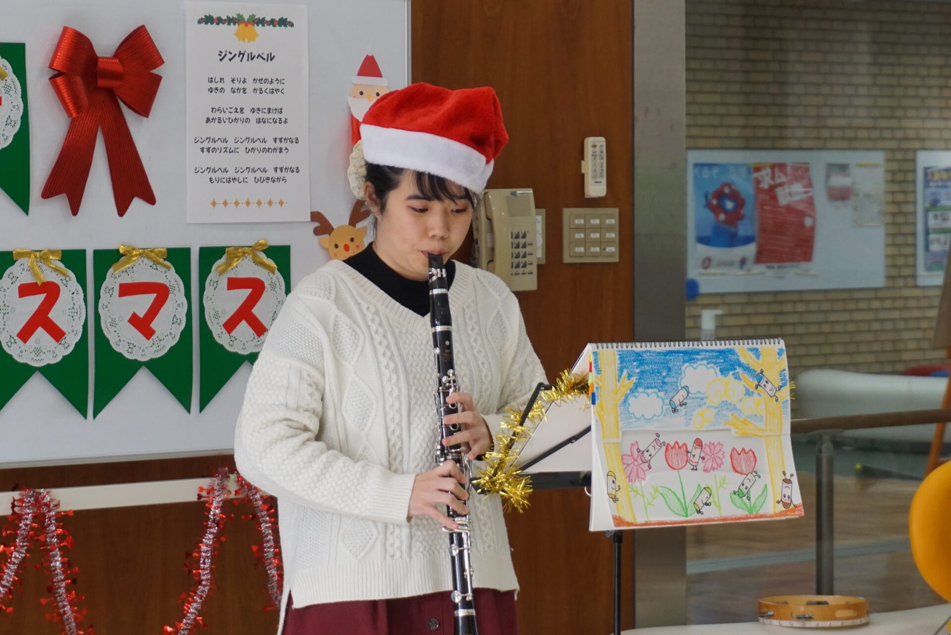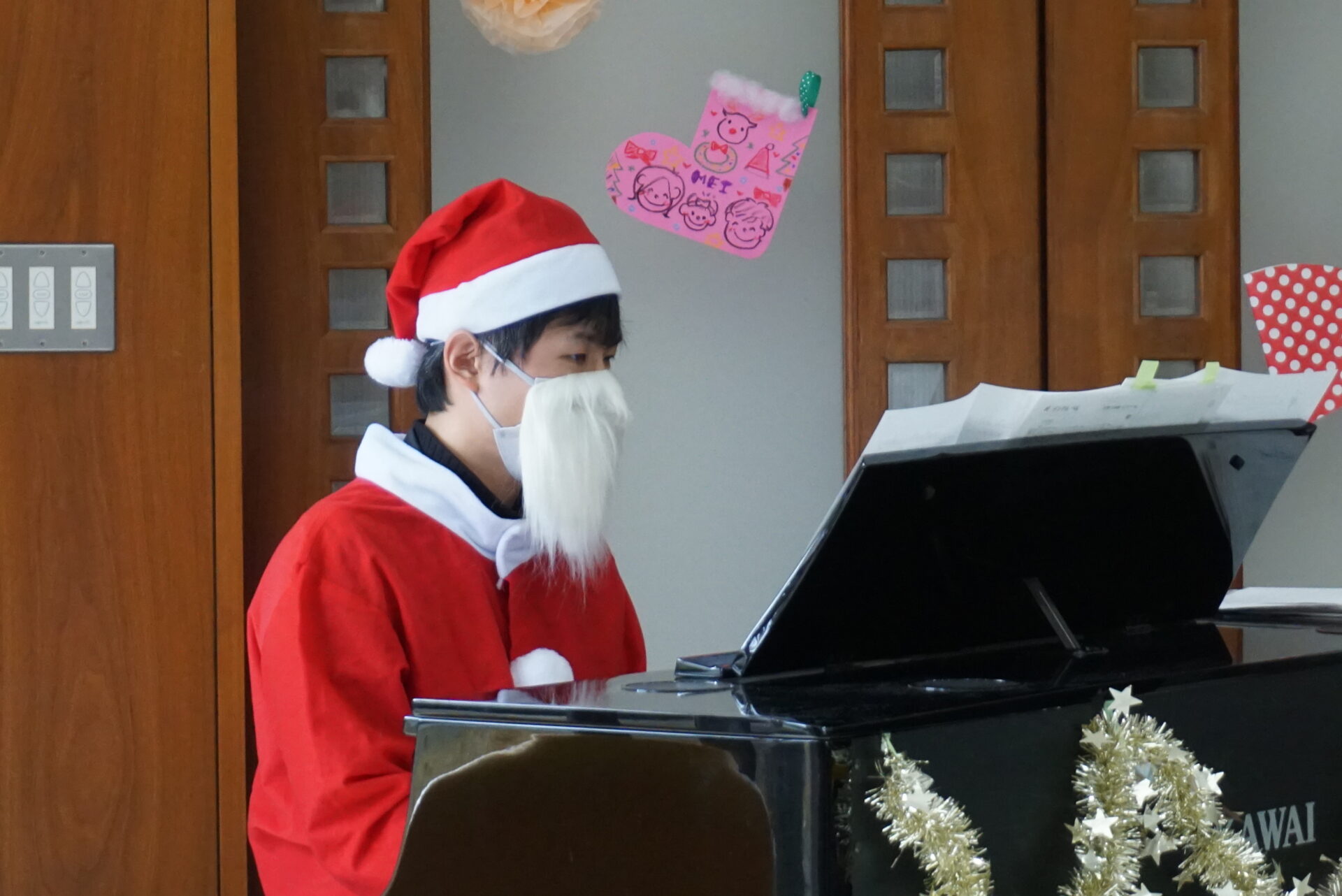 サンタ姿の玉田先生のピアノ演奏と国藤先生の歌がクリスマスの雰囲気を盛り上げます。