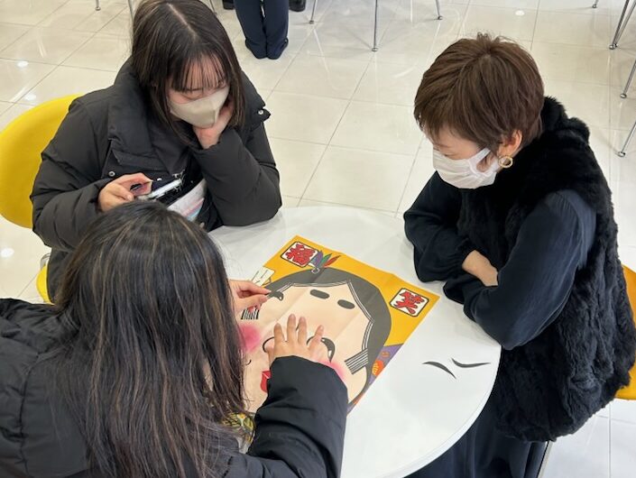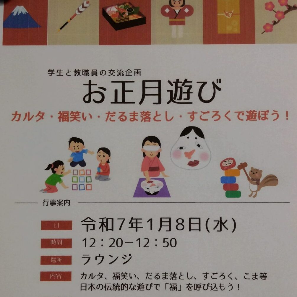 今年最初の学生と教職員交流会では、幼児教育の先生が中心となり、「お正月遊び」を企画しました。カルタやすごろく、福笑い、だるま落としといった日本の伝統的な遊びで楽しみました。