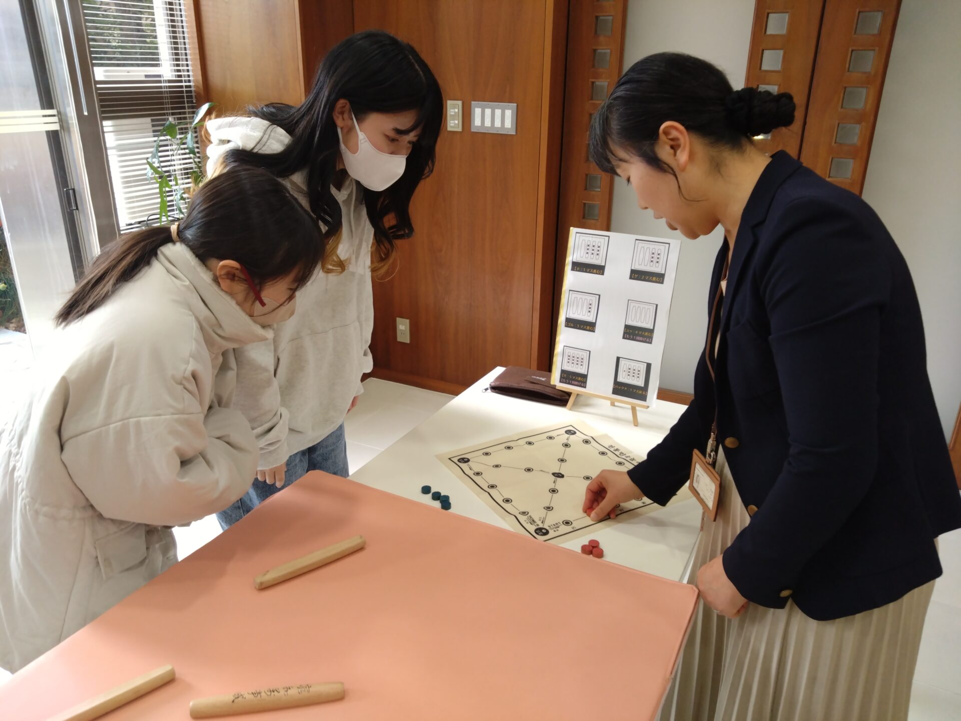 4本の「ユ」という棒を投げ、出た目の分だけコマを進めます。カランカランと鳴る棒の音が心地よい遊びです。簡単に楽しめるルールなので、初めて体験する学生もすぐに理解できました。