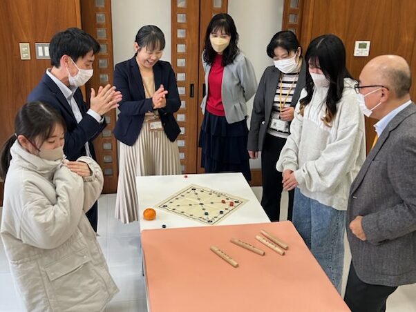 教職員+学生の2人チームになり、対決です。自分たちのコマを進めるためにどんどん攻めるか、安全に堅実に進むか、チームの判断が問われます。楽しみながら、海外の文化にも触れる機会となりました。
