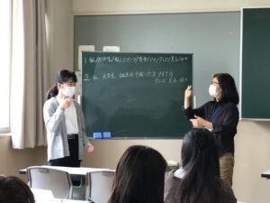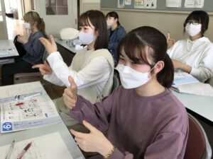 授業紹介 手話 2022.05.19 手話を通して、聴覚障がいをお持ちの方に対しての接し方や対応を学んでいます。 ・私は大学生 ・スポーツが苦手、テレビを見ることが好き ・私の誕生日 ・勉強も仕事もがんばる 手話で、自分のことや趣味について、会話をしました。