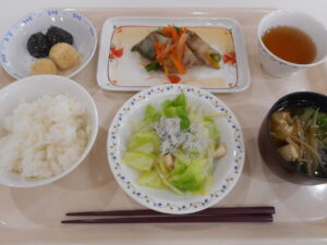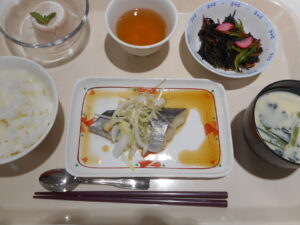 B献立:鰆の酒蒸し、ピーマンの焼き浸し、いちごクリームチーズババロア、豆乳汁、ごはん