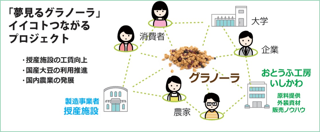 この取り組みは、「就労支援施設の工賃向上」「国産大豆の利用促進」「国内農業の発展」を目標に、就労継続支援B型作業所や国内農家、企業、大学、消費者などが協力し合いながら、おとうふ工房いしかわの「おからクランチ」を主原料にした持続可能な商品開発を進めていく、「夢見るグラノーラ イイコトつながるプロジェクト」として実施しています。昨年、東浦町の就労継続支援B型作業所で「夢見るグラノーラ ベーシックタイプ」が完成しました。そして今年度は、短大がある稲沢市で、稲沢バージョンの商品化を目指して活動をしています。